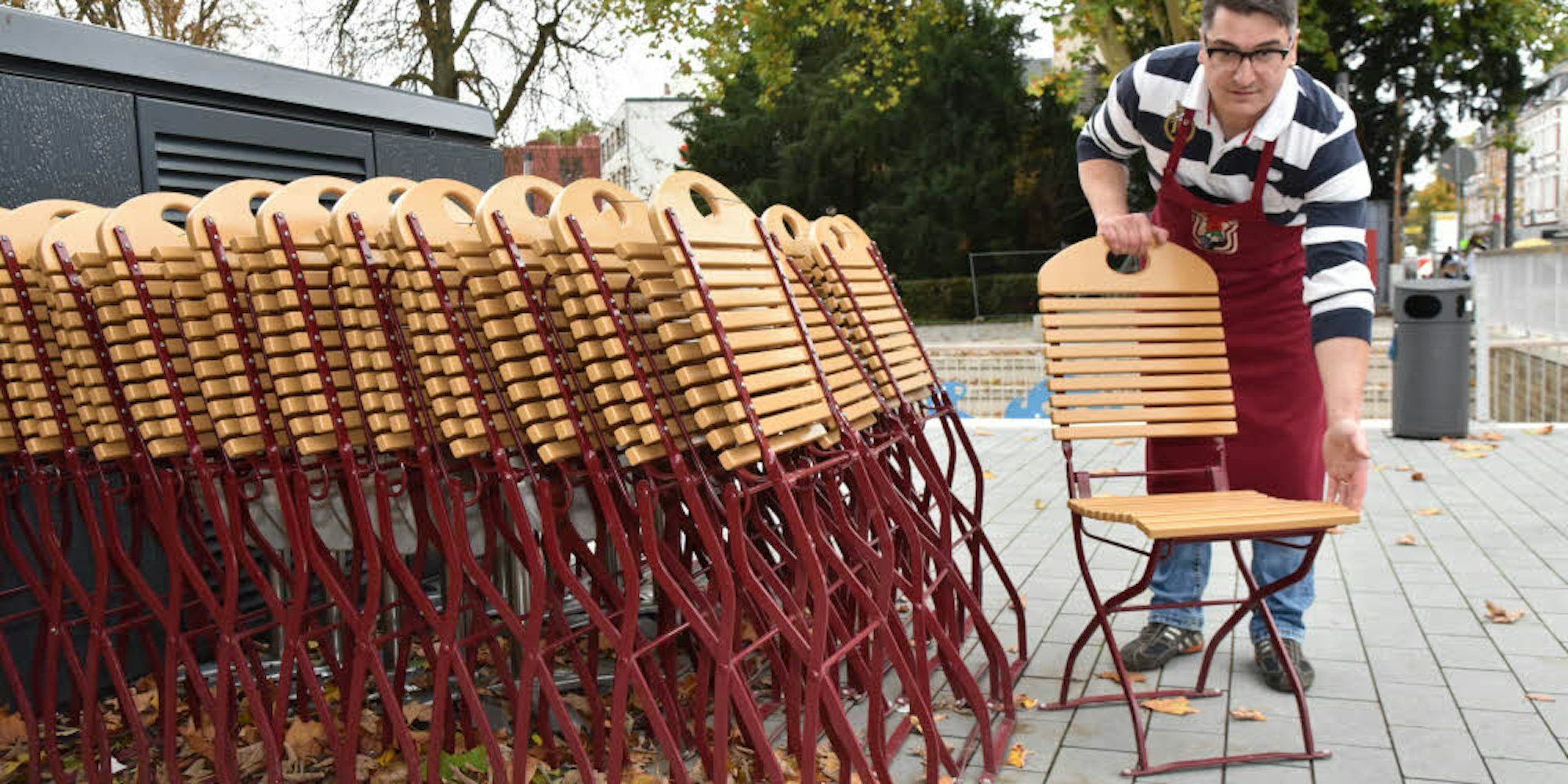 Die Stühle der Terrasse kann Simone Stefani zusammenklappen: Die Zeit für die Außengastronomie ist im Wesentlichen vorbei.