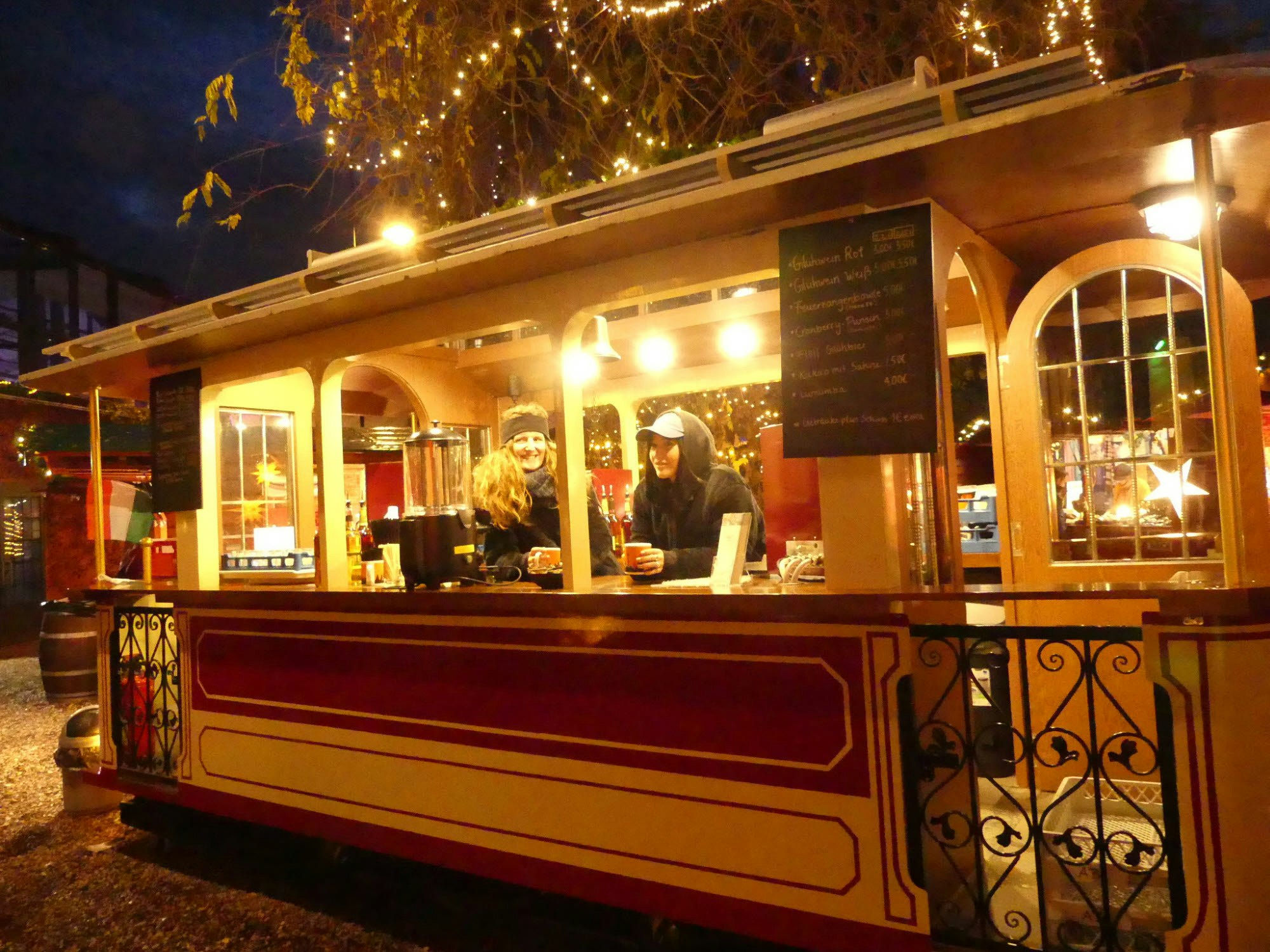 Im Herbrands-Biergarten ist ein Weihnachtsmarkt aufgebaut – mit Glühwein-Waggon.
