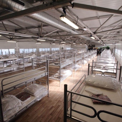 Betten für Flüchtlinge in einer Turnhalle in Deutz.