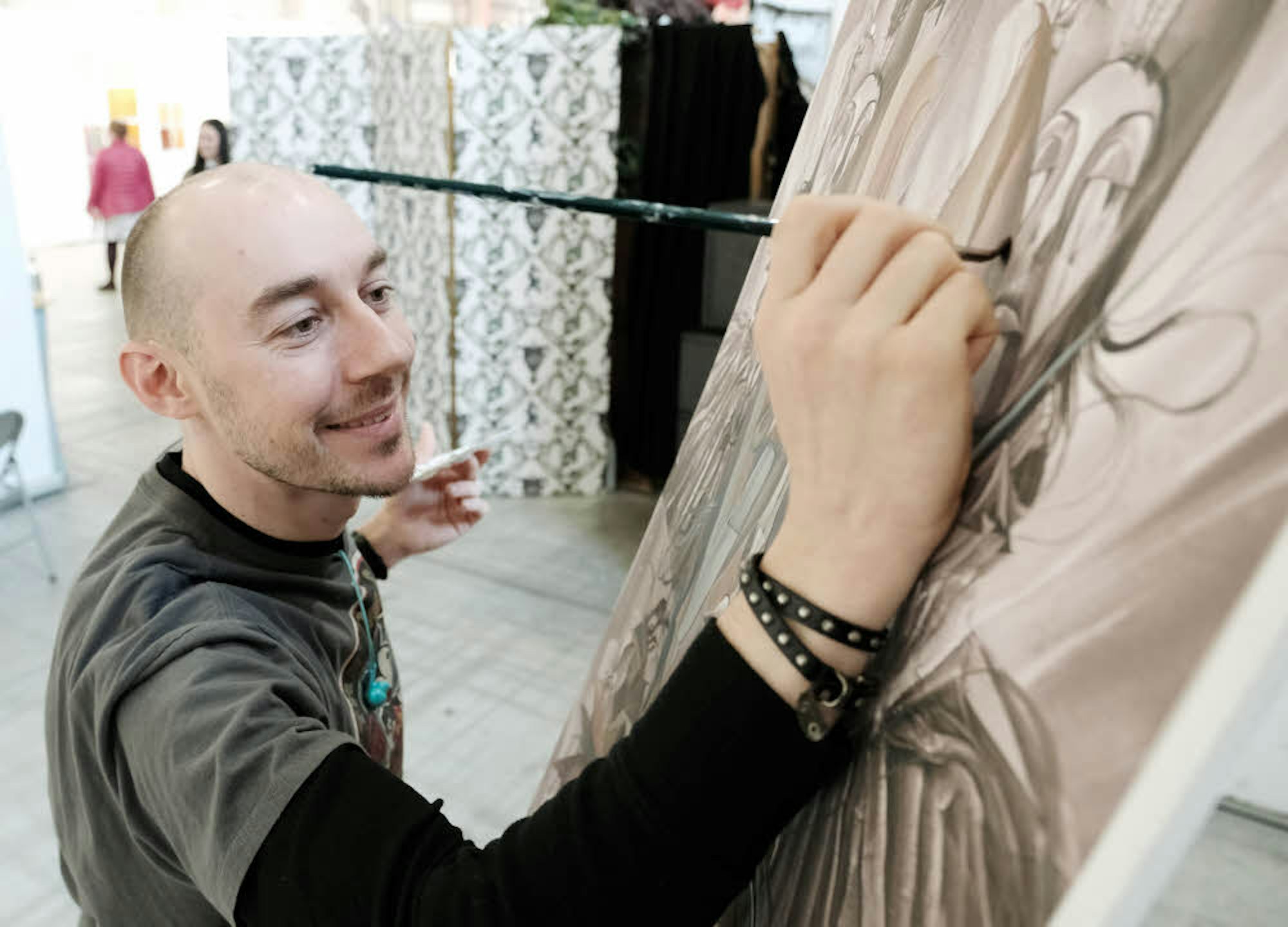Der Künstler steht mit einem Pinsel in der Hand vor einer Leinwand. Im Laufe der Messe entsteht das Kunstwerk direkt vor den Augen der Besucher. An diesem letzten Messetag hat er noch sieben Stunden Zeit. Zu seinen Sammlern gehören Musikgrößen wie Alice Cooper, Maroon5 und die Foo Fighters. Der Künstler selbst verortet seinen Stil irgendwo zwischen Art Déco, Mickey Mouse und Tim Burton.