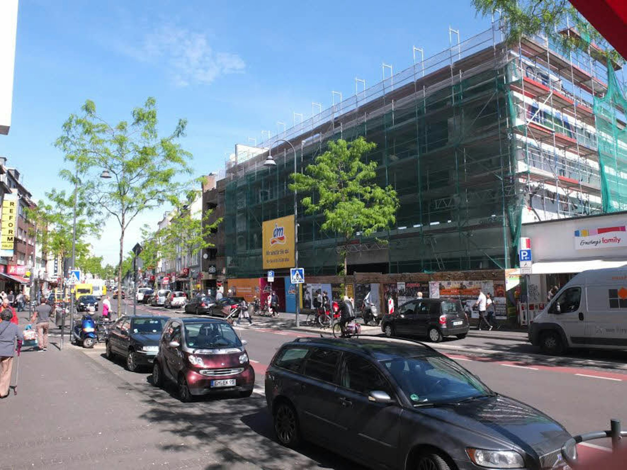 Die ehemalige Kaufhalle/Woolworth-Filiale hat schon einen Nachmieter. Doch der muss sich ebenso in Geduld üben wie die Kundschaft. Das Gebäude ist komplett eingerüstet, gearbeitet wird aber nicht. Eine Baugenehmigung für den lange geplanten Umbau des Ladenlokals im Erdgeschoss zu einem Rewe-Supermarkt liegt zwar vor, aber auch eine Klage aus der Nachbarschaft.
