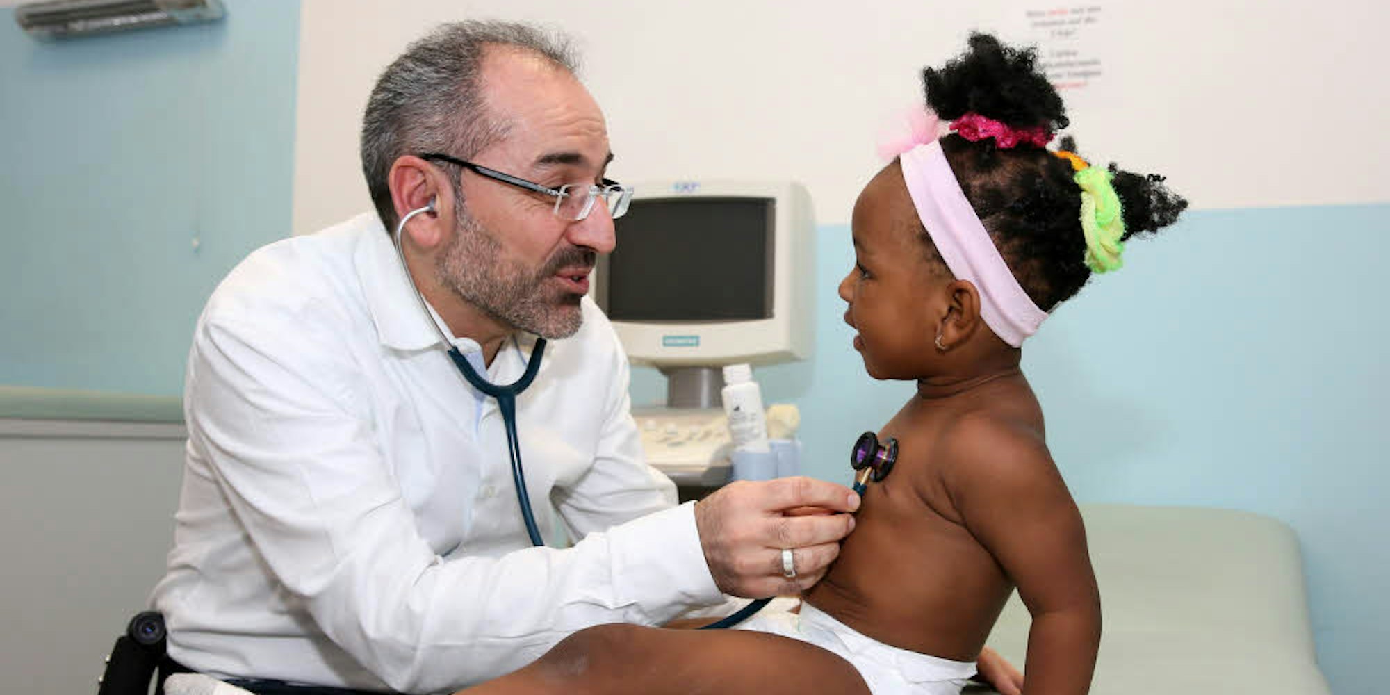 Vorsorgeuntersuchung bei der kleinen Joanna aus Nigeria. Kinderarzt Taner Uguz arbeitet am Rande der Belastungsgrenze.