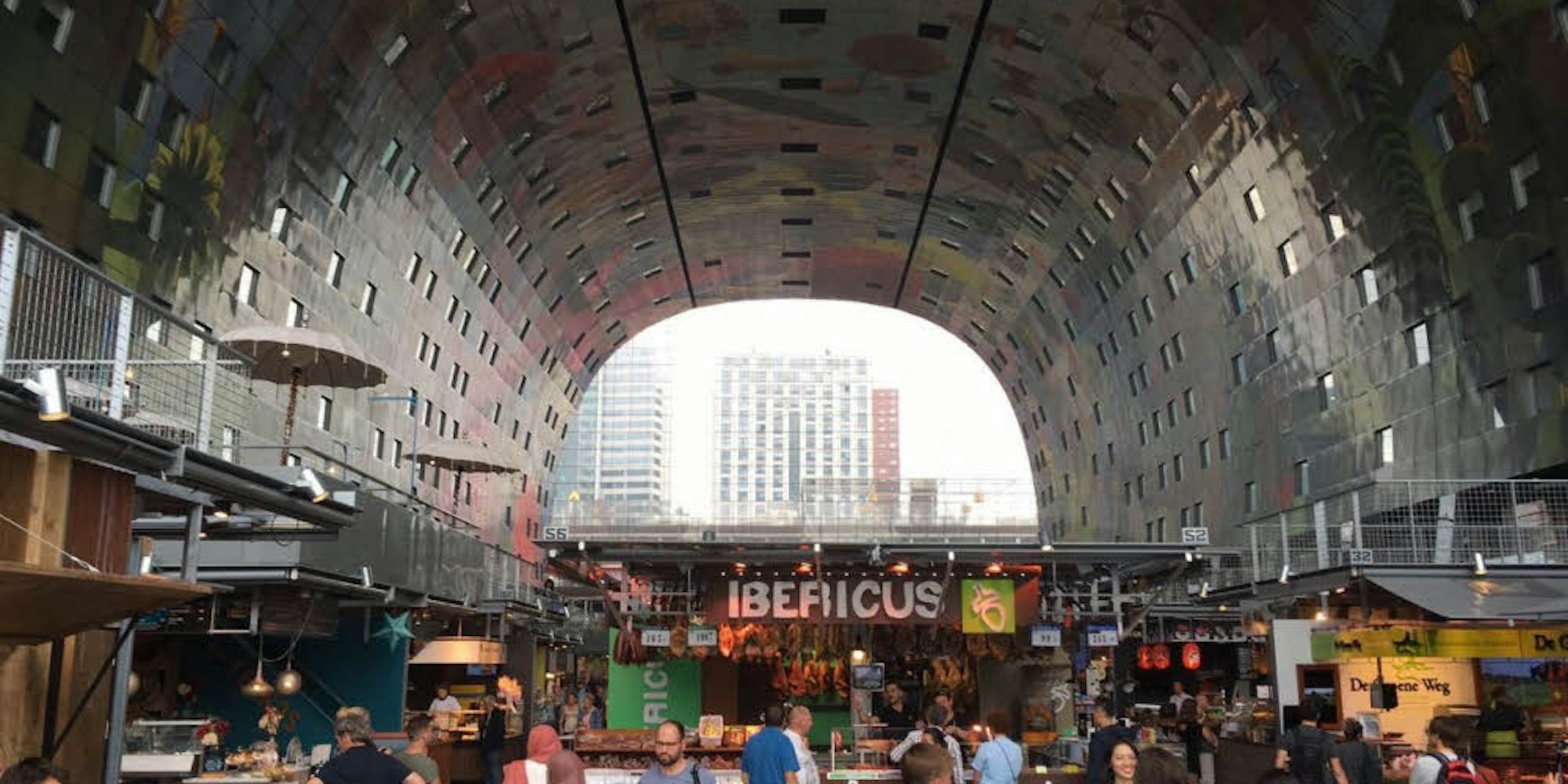 Die Markthalle in Rotterdam wird von einem architektonisch kühnen Wohngebäude überwölbt.