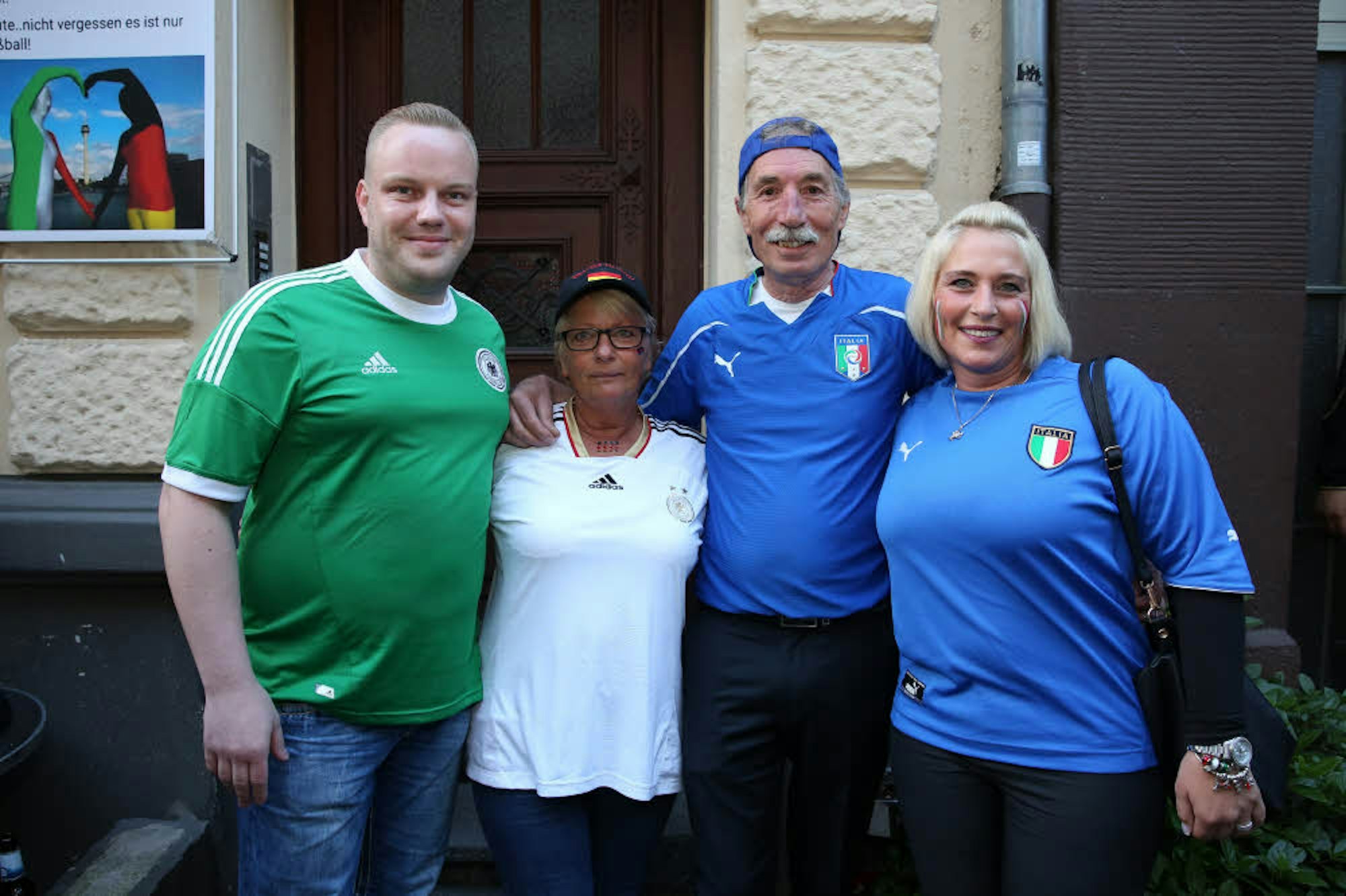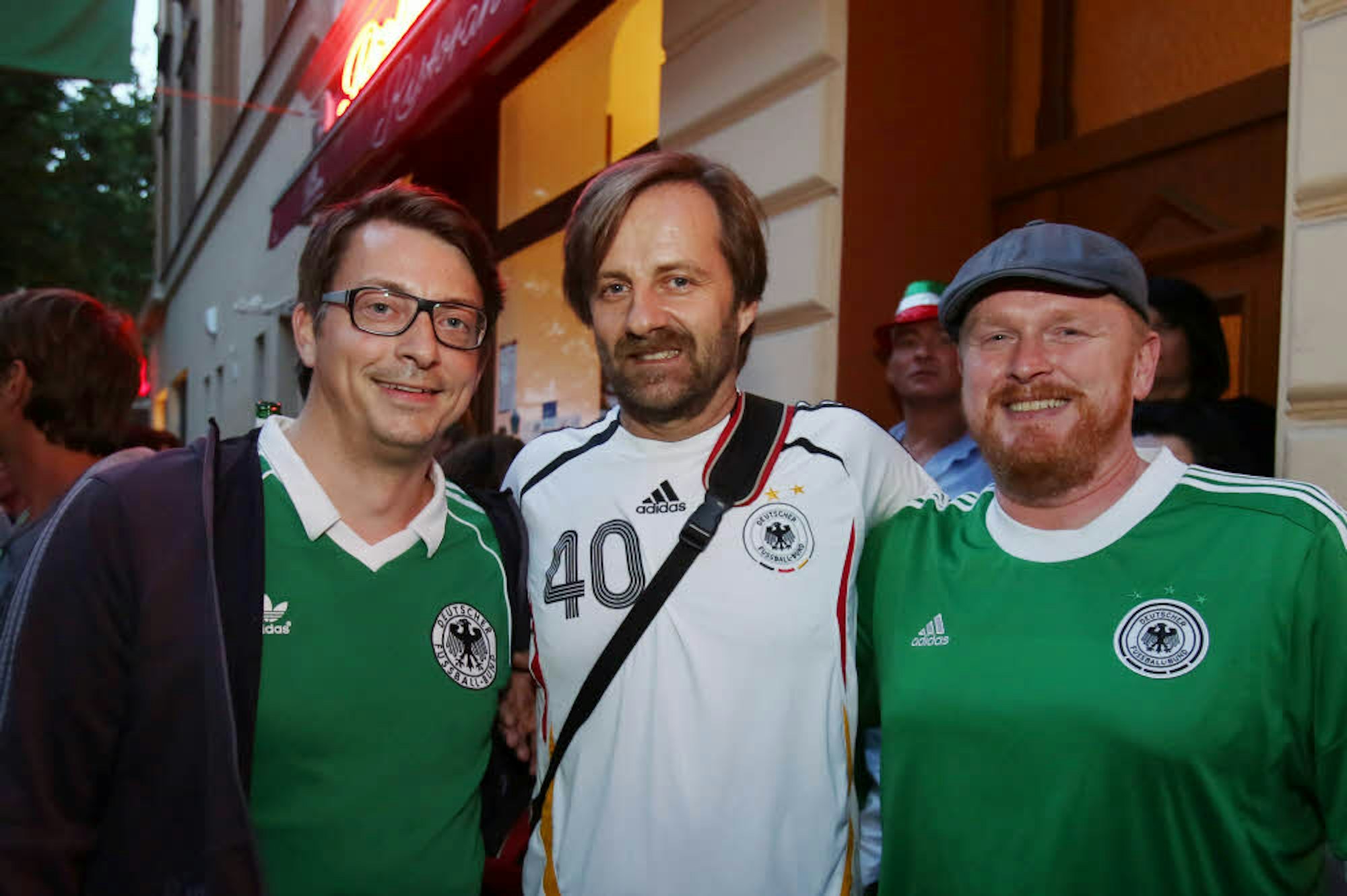 Das Spiel plätschert vor sich hin, Petra K. fragt neben drei Deutschlandtriktotträgern stehend: „Stimmt das eigentlich, dass Jogi ein Toupet trägt? Mein Vater ist überzeugt davon!“ Die Deutschlandtrikotträger sind Stefan (Effe), Alex und Matthias aus Holweide, Nippes und Ehrenfeld, sie sind „wegen der Stimmung hier, wäre schon lustig, hier zu erleben, wie wir den Italien-Fluch besiegen“, sagt Effe. Er ist da „sehr, sehr zuversichtlich“.