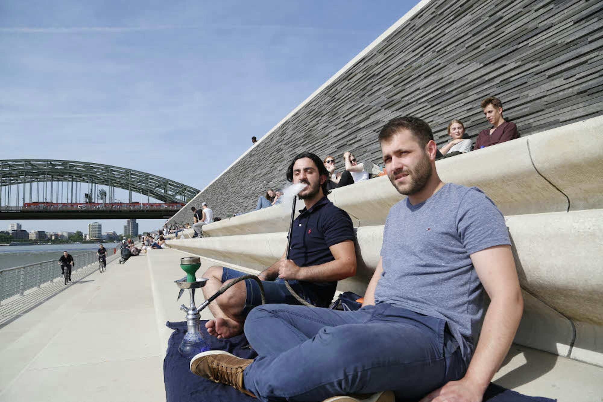 Burak Carikci (l.) und Kevin Heinz rauchen auf dem Rheinboulevard Shisha.