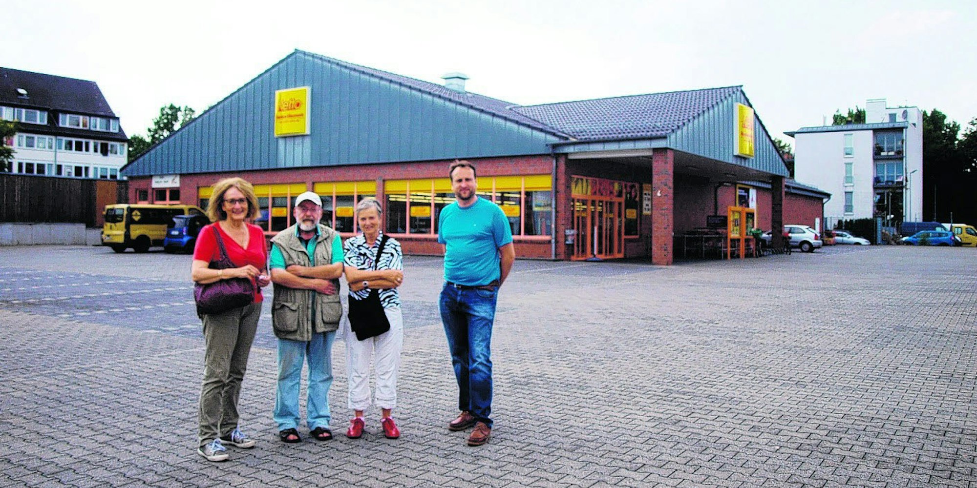 Ortsbesichtigung vor einem Supermarkt: Bezirksvertreter Inge Klein (Grüne, l), Lothar Müller (Die Linke), Claudia Pinl und Florian Weber-Baranowsky (beide Grüne).