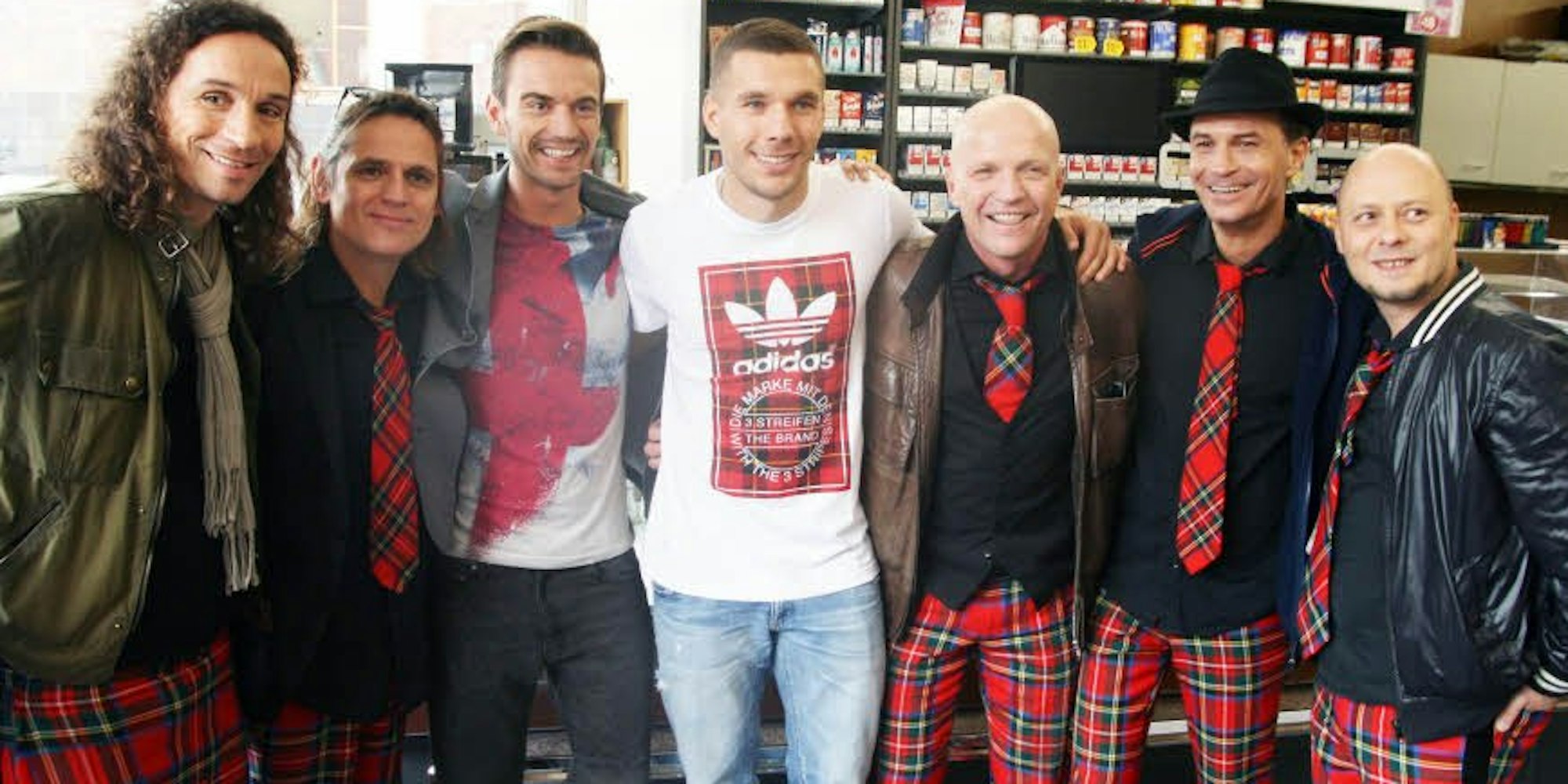 Lukas Podolski und die Musiker von Brings beim Videodreh in einem Kiosk an der Schanzenstraße in Köln-Mülheim.