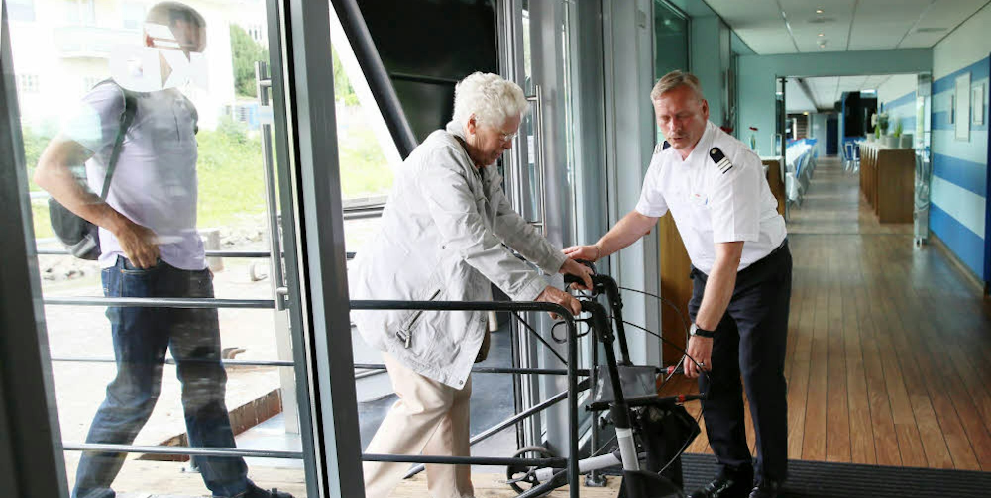 Harald Kampe hilft älteren Herrschaften beim Einsteigen.