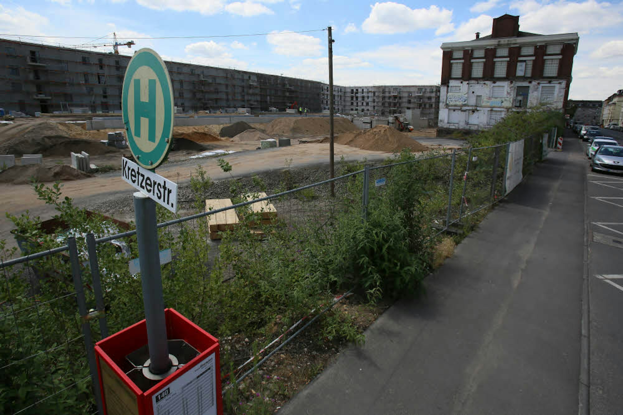 An der Xantener Straße liegen noch viele Baugruben. Rechts das alte Magazinhaus von Clouth, Halle 18.