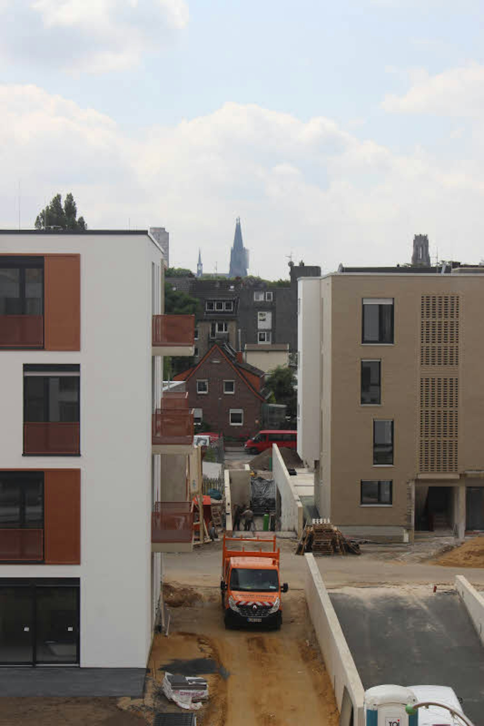 Nippes – Da sage doch jemand, die besten Aussichten des neuen Veedels gäbe es nur gegen Höchstgebot. Im Obergeschoss des Gebäudes südlich des Luftschiffplatzes im Clouth-Quartier, das die Wohnungsgesellschaft der Stadtwerke Köln als preisgedämpftes Miet-Objekt baut, wird sich sowohl eine Panorama-Sicht auf den künftigen zentralen Park bieten, als auch in Richtung Süden ein Blick auf den Dom.