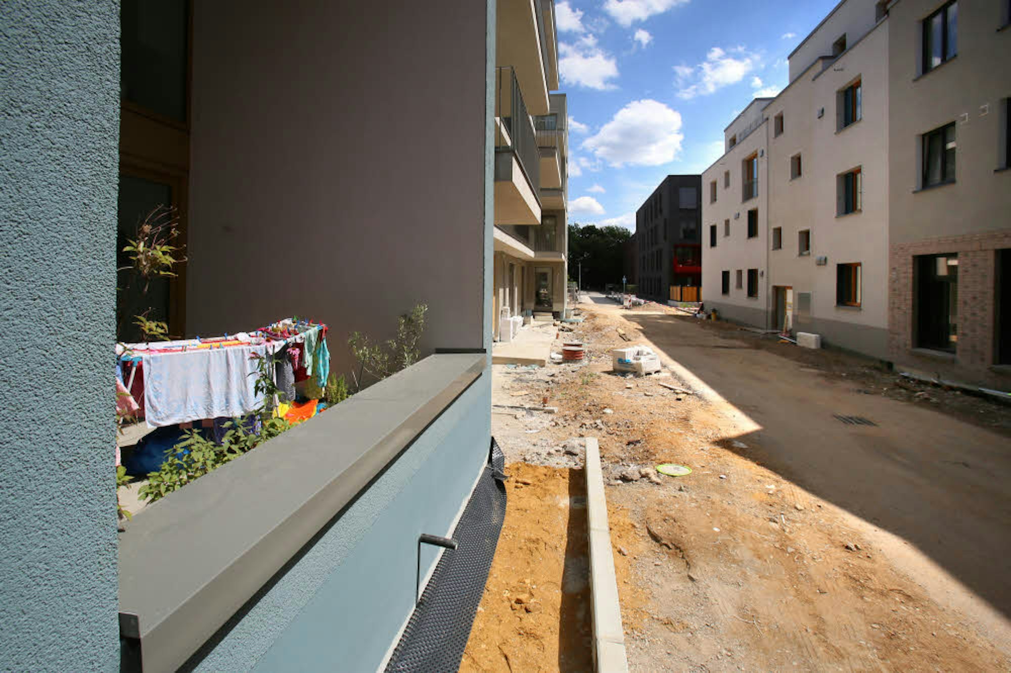 Leben auf der temporären Baustelle: Immer mehr Wohnungen auf dem Areal sind inzwischen bezogen, hier wird nebenan noch gebaut.