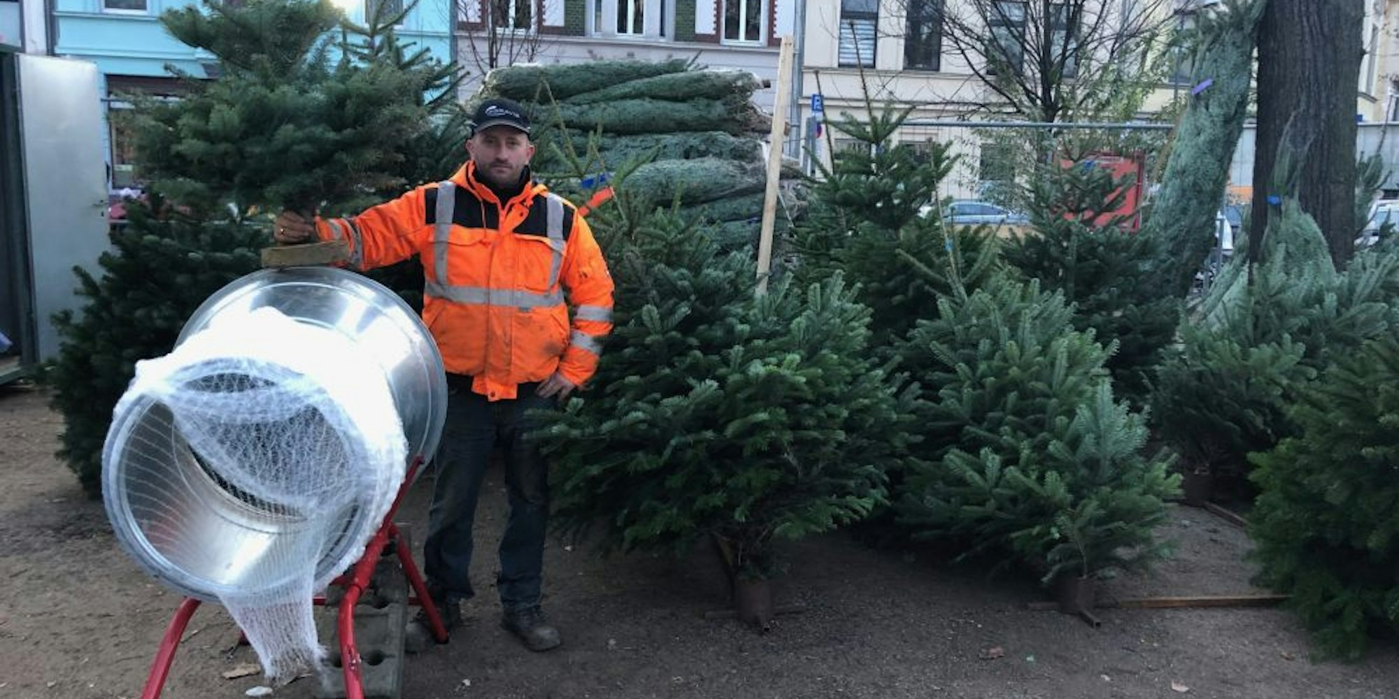 Kai Bitter verkauft Weihnachtsbäume auf dem Lenauplatz in Neuehrenfeld.