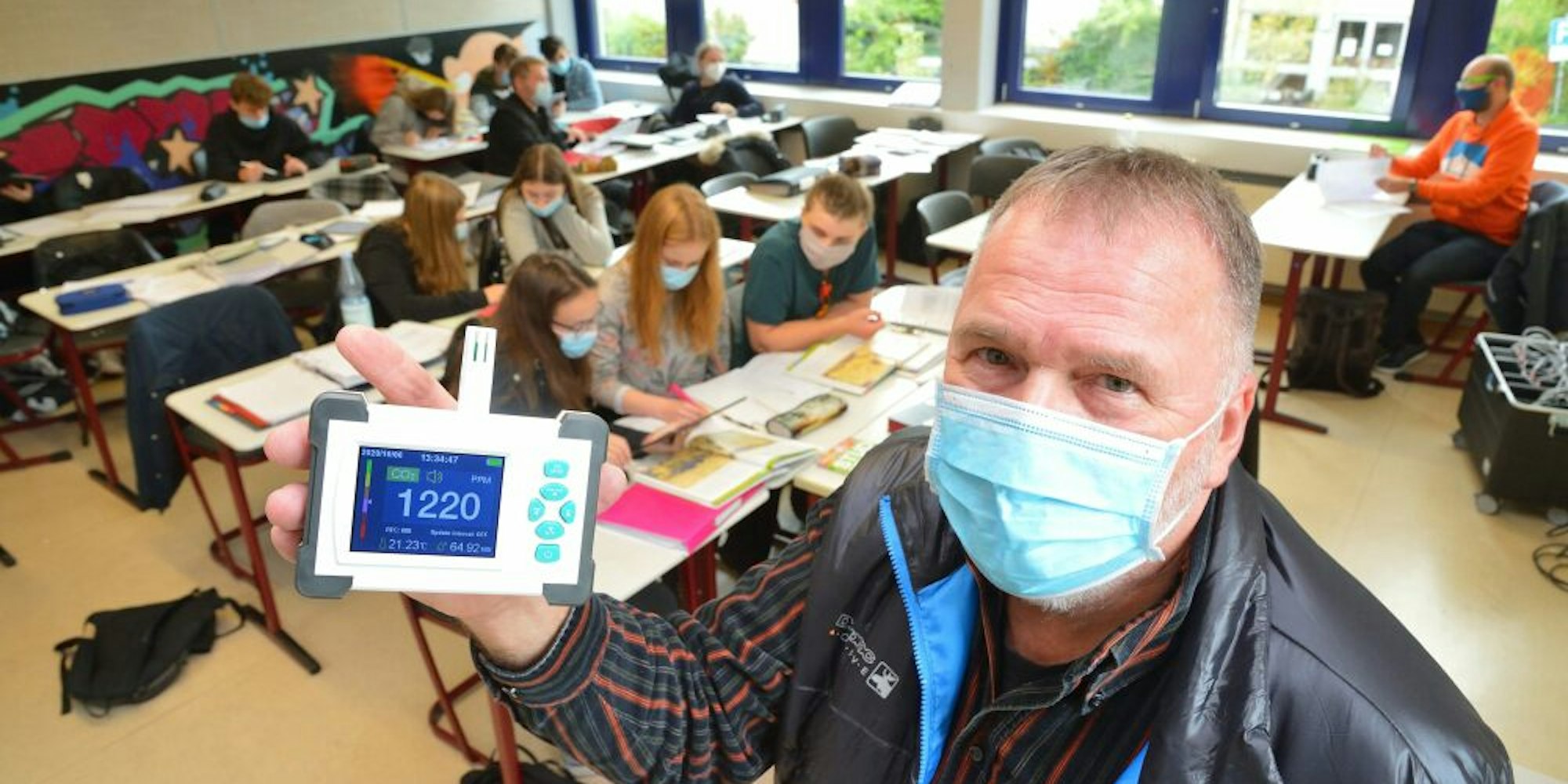 Kürten – Lüften ist das A und O, um die Konzentration möglicher Viren in der Raumluft gering zu halten. In der Gesamtschule Kürten sind deshalb Fenster und die Türen zu den Fluren in den meisten Klassenräumen geöffnet. Kein Problem war das, so lange es draußen warm war. Doch an diesem Morgen sitzen zumindest die Schülerinnen und Schüler an den Fenstern in dicken Jacken da. „Bei Minusgrade wird auch das nicht mehr gehen“, sagt Schulleiter Klaus Schröder und zeigt mit einem kleinen Gerät, warum in Corona-Zeiten trotzdem nicht auf Frischluftzufuhr verzichtet werden kann.