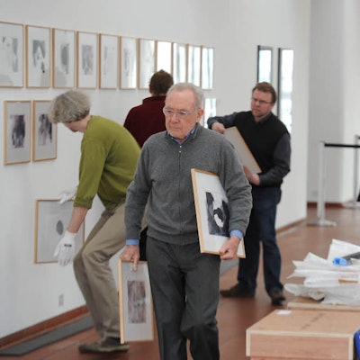 Gerhard Richter rückt Bilder im Kölner Museum Ludwig zurecht.