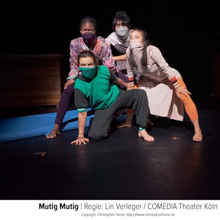 Die Abendpremiere mag in dem, was sie dem jungen Publikum unterbreiten will — Mutproben besteht man am besten gemeinsam, und manchmal ist es mutiger, zu einer Mutprobe „Nein“ zu sagen — weniger ehrgeizig sein, formal wagt sie dafür umso mehr: Mit „mutig mutig“ übersetzt die Choreographin Lin Verleger das gleichnamige Kinderbuch von Lorenz Pauli und Kathrin Schäfer in ein (fast) sprachloses Tanzstück, wobei drei Tänzerinnen — Khadidiatou Bangoura, Viola Luise Barner, Yurika Sophie Yamamato — und die bewährte Comedia-Akteurin Sibel Polat die Rollen der vier Freunde Frosch, Maus, Schnecke und Spatz übernehmen, die sich gegenseitig zu immer neuen Mutproben herausfordern.