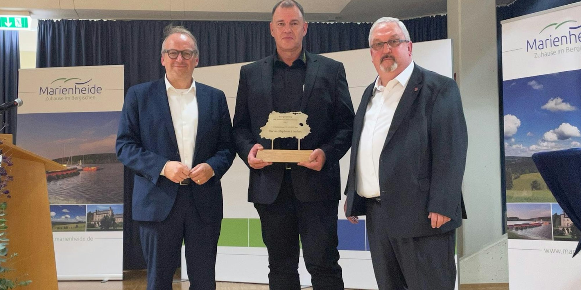 Ein Hoch auf das Ehrenamt: (v.l.) Christoph Waffenschmidt (World Vision), Preisträger Stephan Linden und Bürgermeister Stefan Meisenberg bei der Verleihung des Marienheider Bürgerpreises.