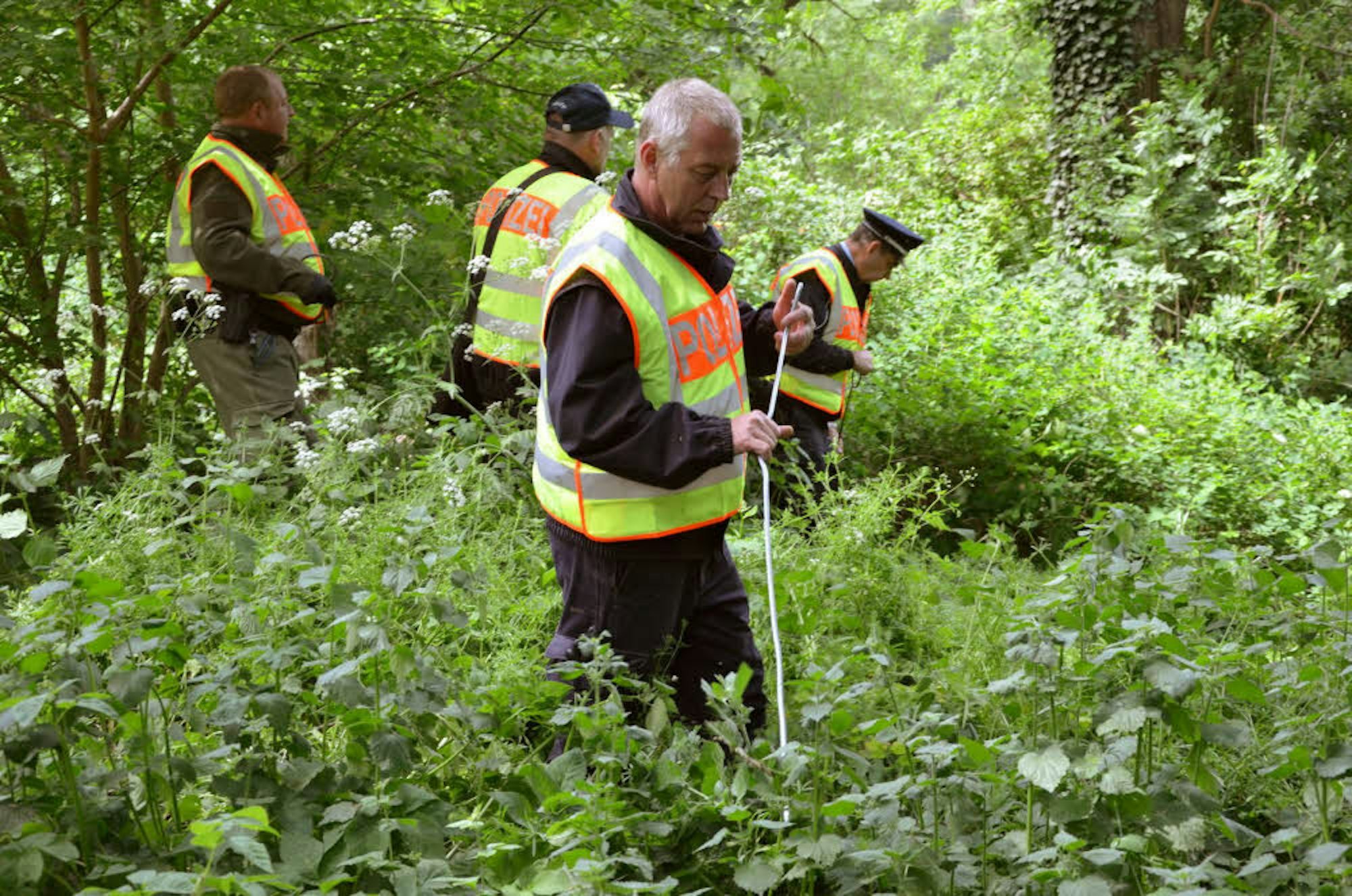 In engen Ketten durchkämmen sie den Forst. Teiche werden leer gepumpt und Misthaufen durchwühlt. Die Suche ist so intensiv, dass verrostete Haarspangen im Unterholz gefunden werden.