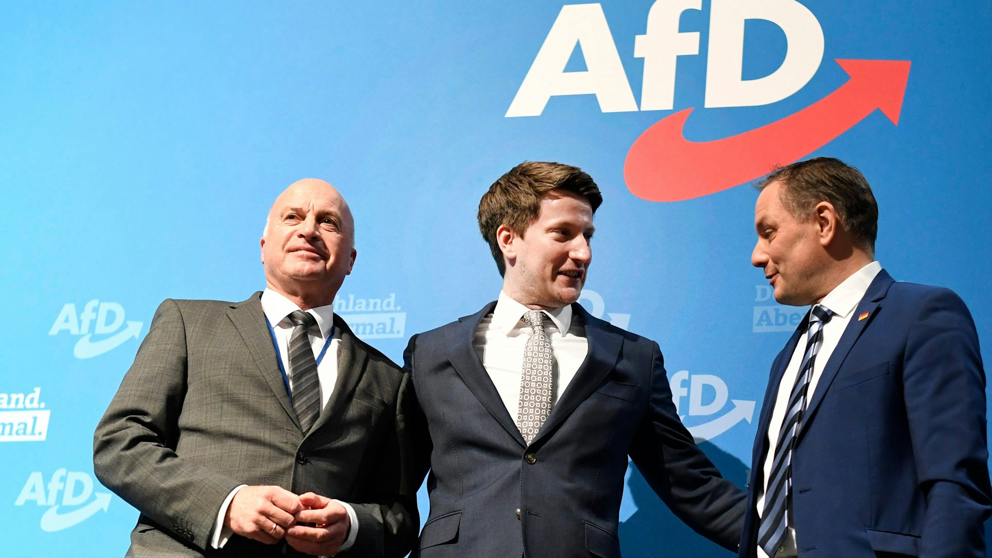 Der Landesvorsitzende der AfD in Nordrhein-Westfalen, Martin Vincentz (M.), freut sich im Februar 2022 mit seinem Vorgänger Rüdiger Lucassen (l.) und dem Bundessprecher Tino Chrupalla über seine Wahl.