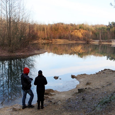 Von einer Anhöhe kann man schräg rechts über die Große Dhünn-Talsperre hinwegschauen. Die zweitgrößte reine Trinkwassertalsperre Deutschlands mit einem Fassungsvermögen von 81 Millionen Kubikmetern Wasser ist ganz in der Nähe, aber natürlich gut geschützt.
