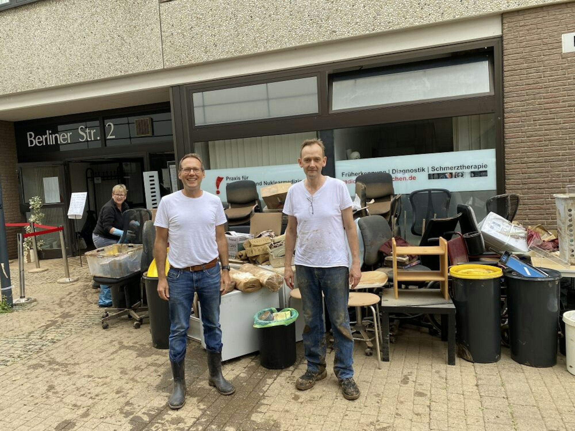 Euskirchen – Der Müllberg vor der Praxis für Radiologie und Nuklearmedizin an der Berliner Straße wuchs am Montag im Minutentakt. Mitarbeiterinnen und Ärzte mühten sich gemeinsam, die Räume von Schlamm und Schmutz zu befreien und zu retten, was zu retten ist.