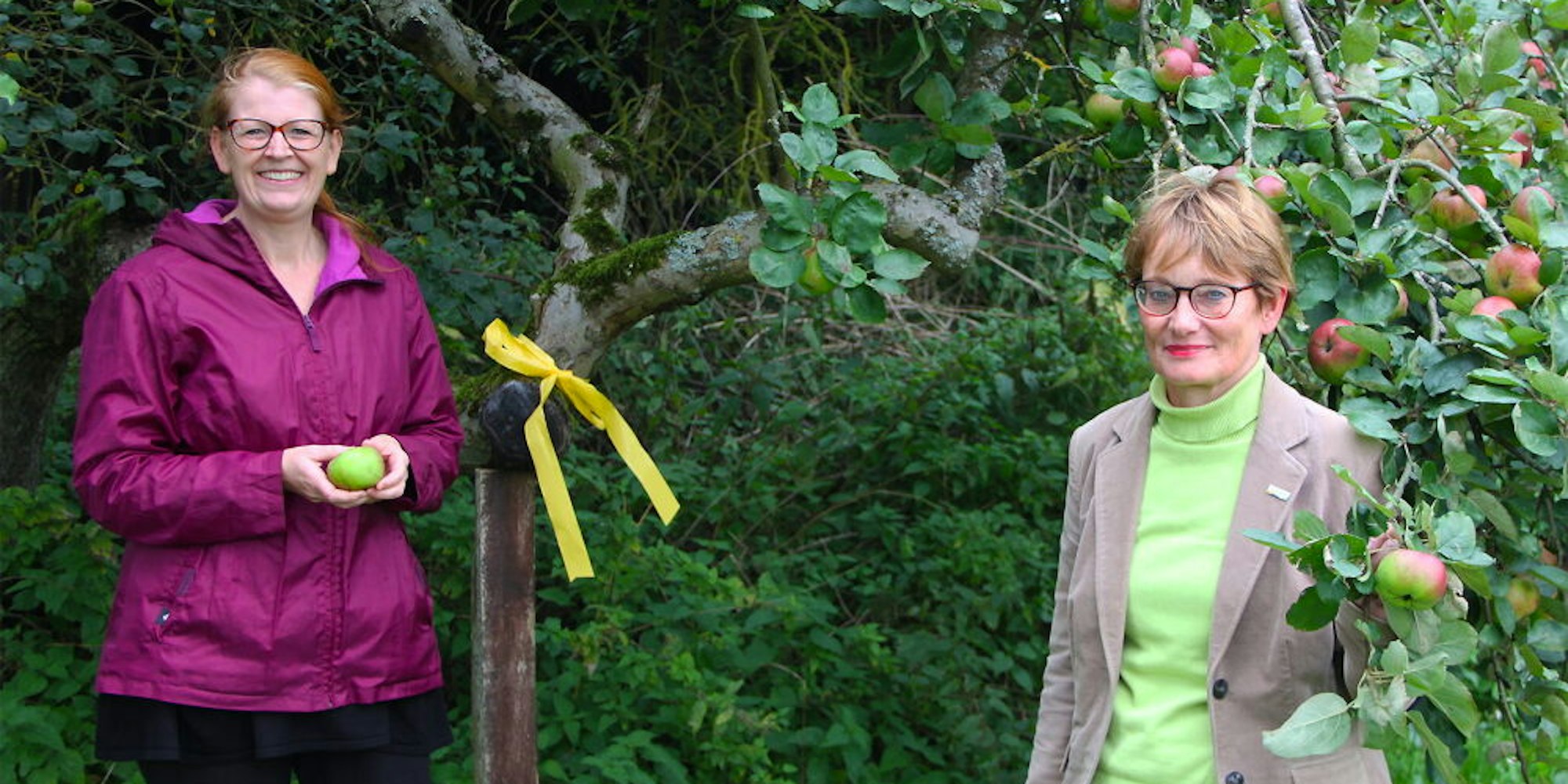 Für die Ernteaktion an Bäumen, die mit einem gelben Band gekennzeichnet sind, werben Judith Maur (l.) und Simone Böhm.