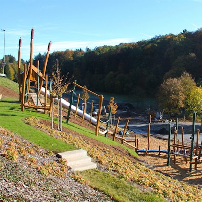 Aus alten Ahr-Rebstöcken ist eine Art Stall gebaut worden, kleine Platten aus Schiefer, ebenfalls in Rech aufgelesen, bedecken den Boden, davor fließt, in Blau auf Pappe gemalt, die stilisierte Ahr.