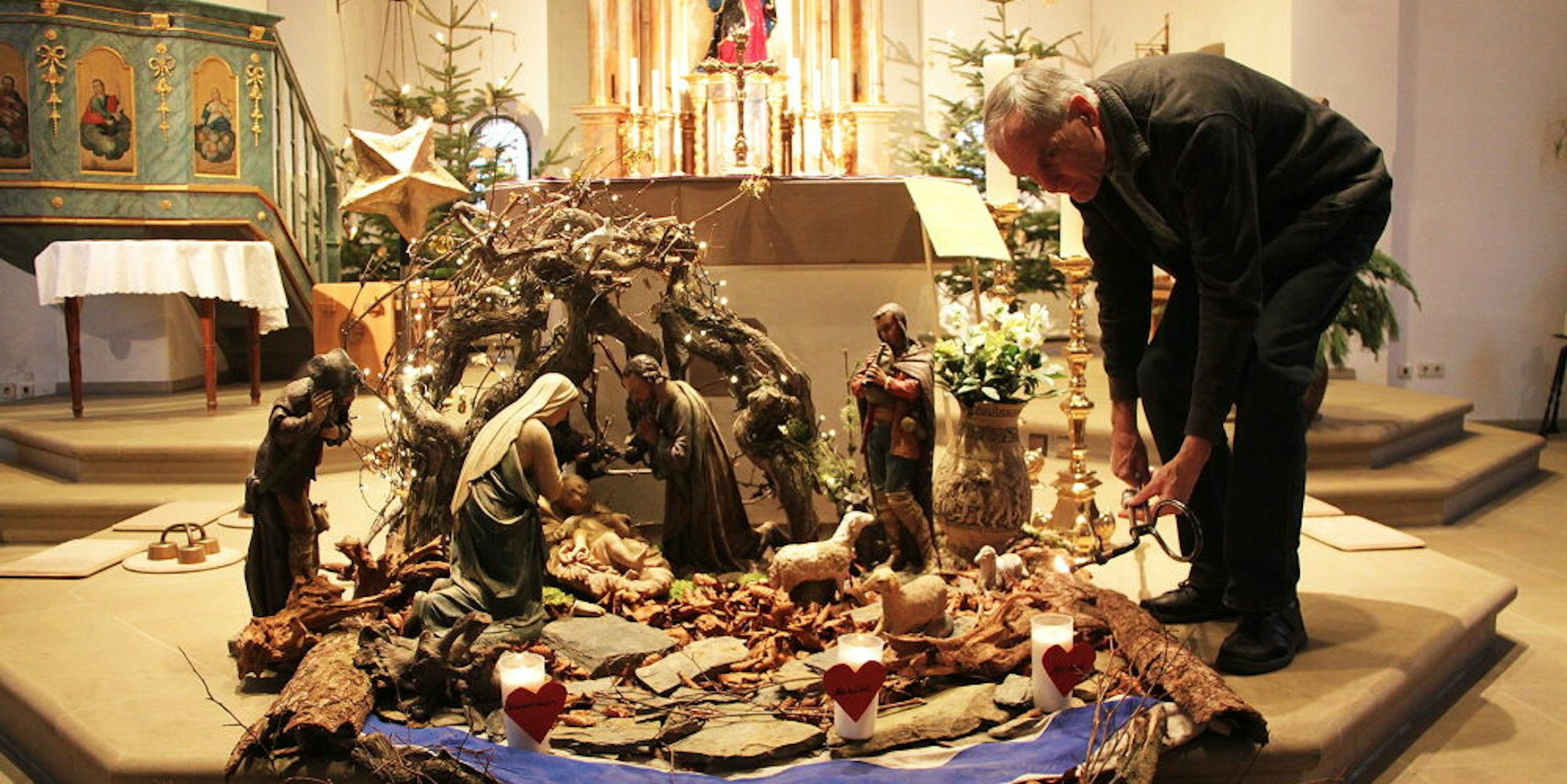 Erwin Stein zündet vor dem Altar der Pfarrkirche St. Mariä Himmelfahrt die Kerzen an. „Die drei kleinen Kerzen hier vorne erinnern an die Orte in der Gemeinde Blankenheim, die von der Juli-Flut betroffen waren“, erklärt der Vorsitzende des Heimatvereins Uedelhoven.