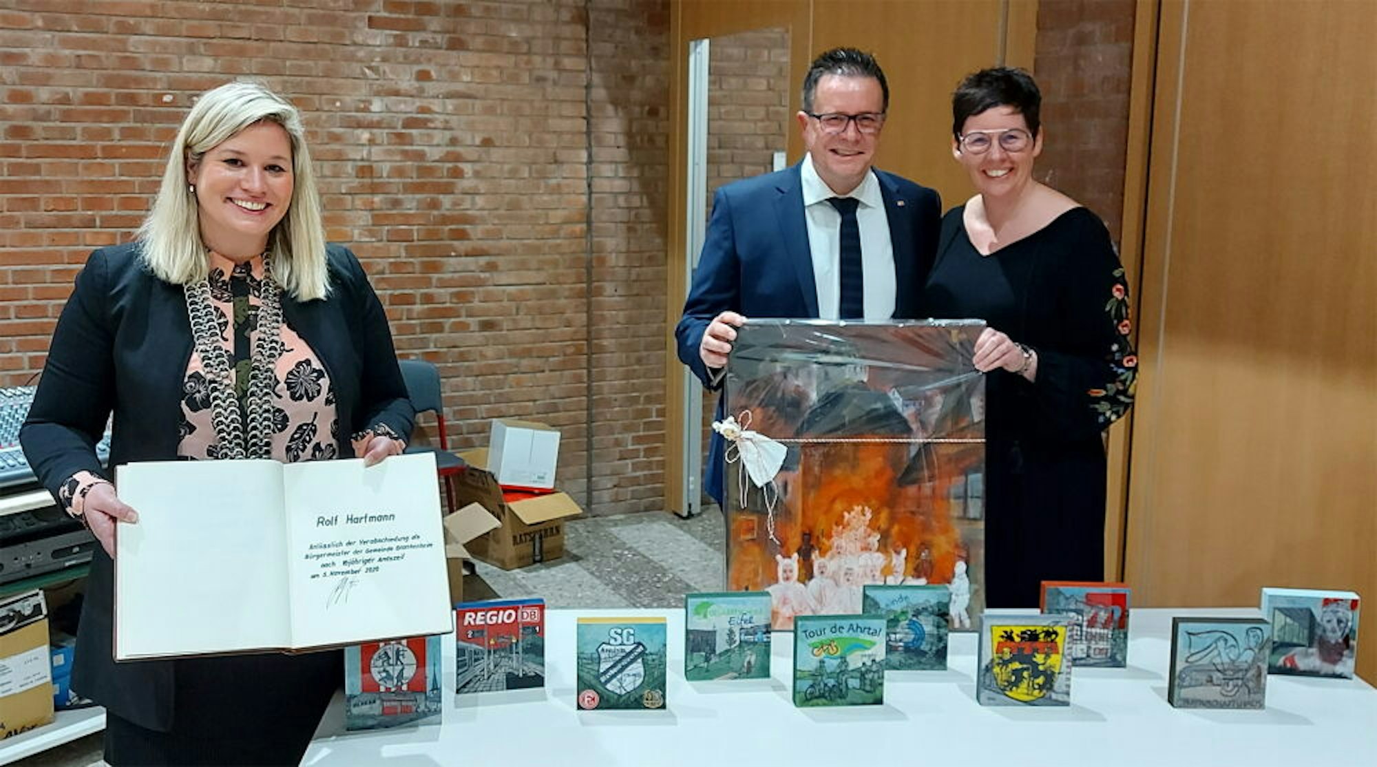 Bürgermeisterin Jennifer Meuren mit dem Goldenen Buch der Gemeinde Blankenheim, in das sich Amtsvorgänger Rolf Hartmann (mit Ehefrau Anja) eingetragen hatte.