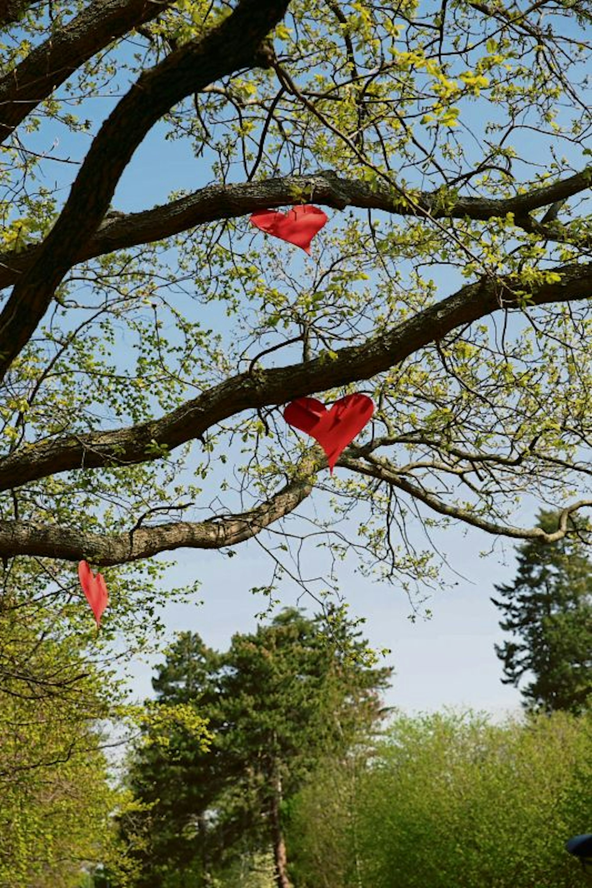 Seit einigen Wochen zieren rote Herzen die Münstereifeler Straße ab dem Stadtwald. Sie hängen in Bäumen und Sträuchern oder stecken auf kleinen Hölzern im Mittelstreifen der Straße oder in den Grünflächen am Gehsteig.