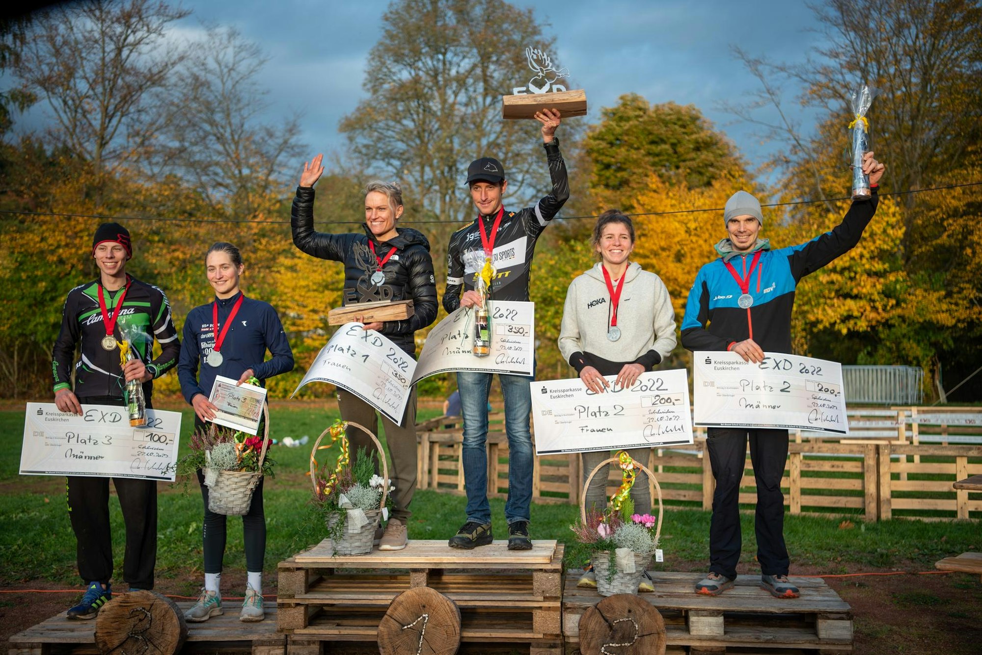 Scheld blickt stolz auf die vergangenen 25 Jahre zurück. Zweimal richtete der TuS Schleiden in dieser Zeit die Deutschen Meisterschaften im Crossduathlon aus. Rekord-Sieger des Rennens ist Torsten Langer. 13-mal belegte er Platz eins. „Und das innerhalb der ersten 15 Jahre“, so Scheld. Dahinter folgt Mathias Frohn. Der Lokalmatador gewann das Rennen bereits viermal und ging auch in diesem Jahr als Favorit mit der Startnummer 1 an den Start. Doch dem Europameister musste er sich geschlagen geben. Frohn lief drei Minuten nach Carabin ins Ziel und landete damit auf dem zweiten Platz. Dritter wurde Julius Drees (Tri-Club Wuppertal).