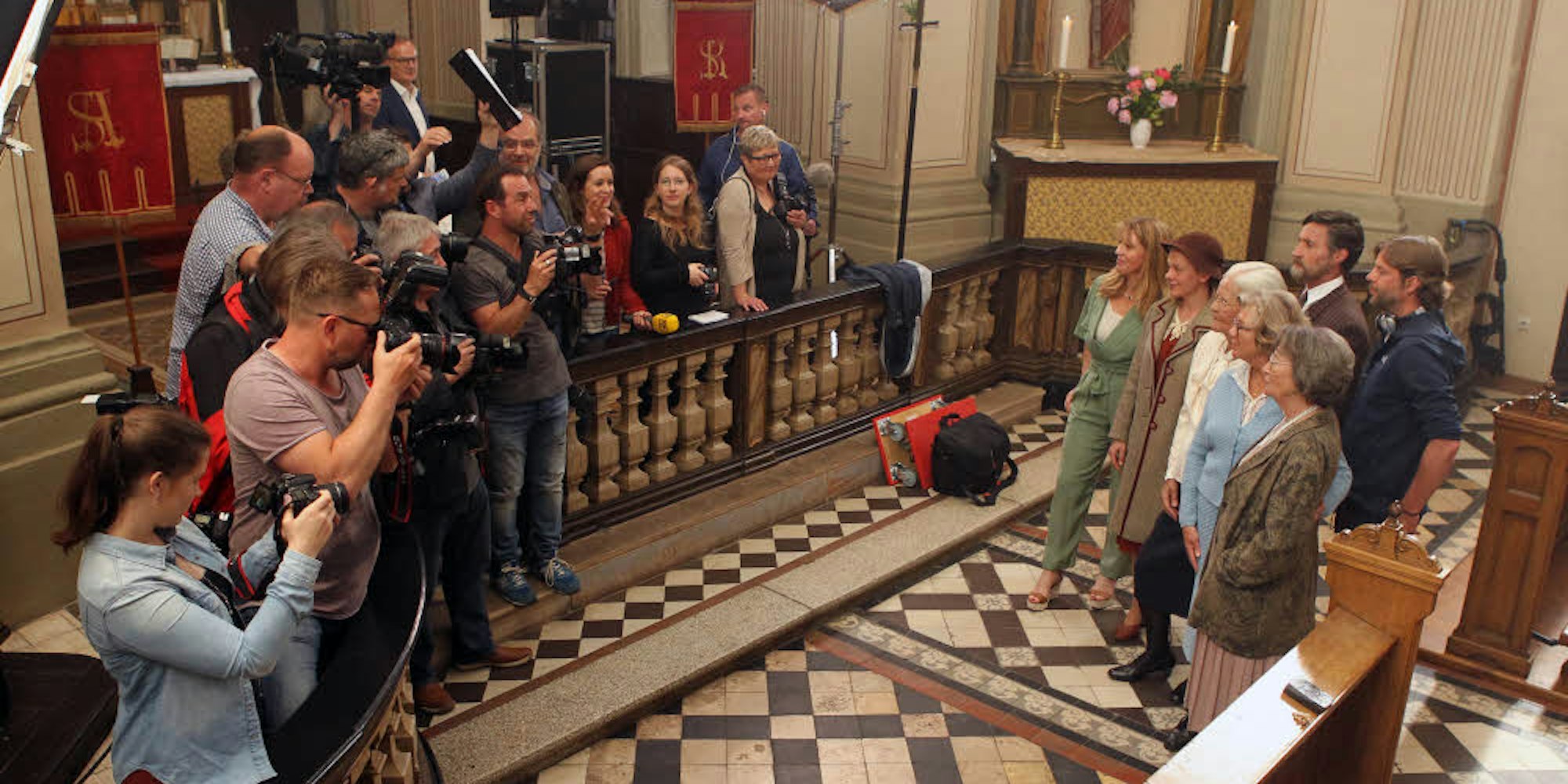 Die eingeladenen Journalisten sehen davon nichts. Schließlich ist es ein Film, da ist vieles geheim, Störungen sind nicht erwünscht. Auch nicht, wenn die Protagonisten zum Gruppenbild neben der Kirche stehen. „Nein, keine Pressefotos“, ruft eine junge Frau mit klobiger Brille: „Die Masken der Schauspieler sind nicht für Außenaufnahmen.“ Wenige Minuten später entsteht das gleiche Gruppenbild im Kircheninneren.