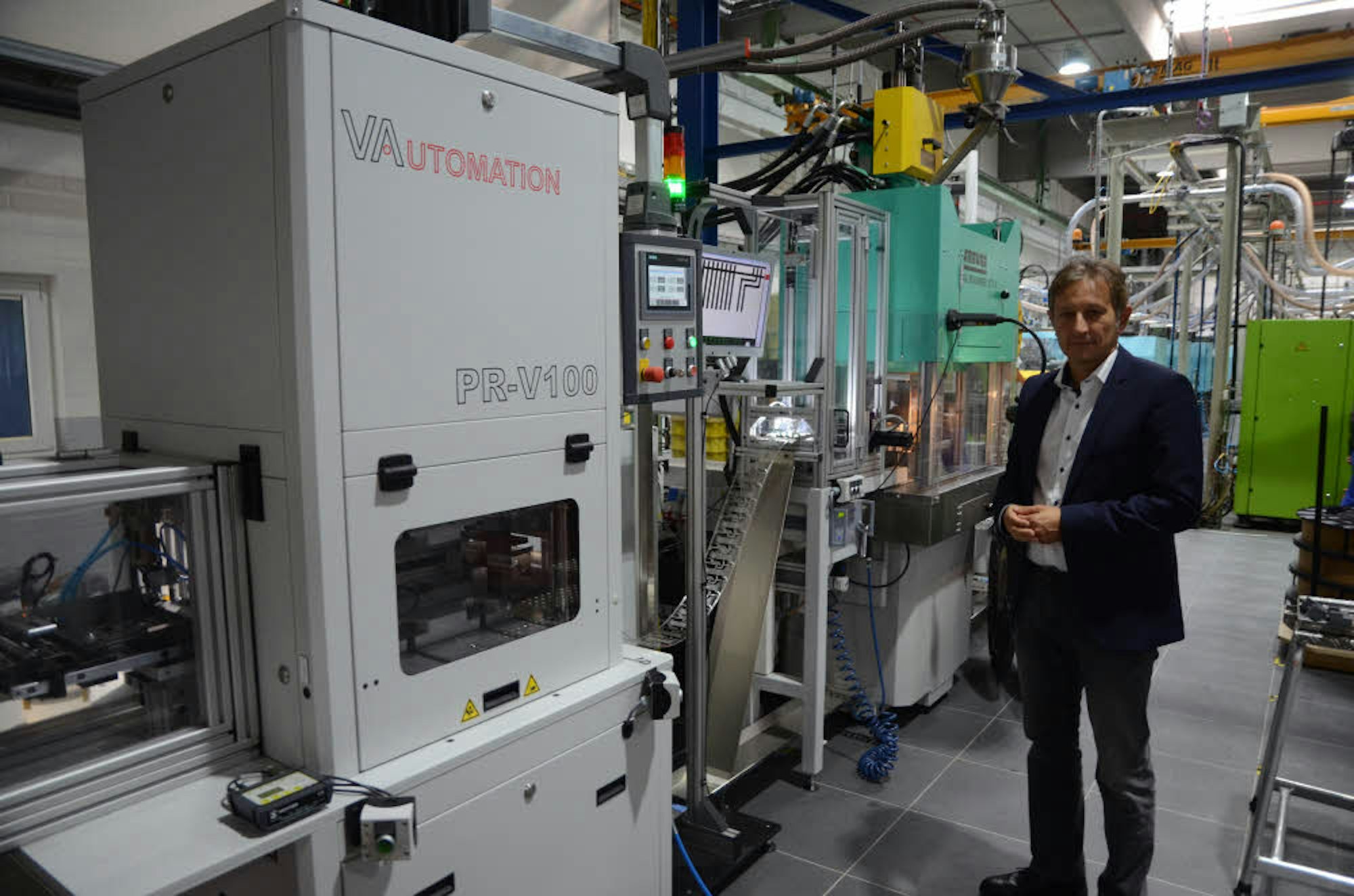 Geschäftsführer Selahattin Servi an einer der automatisch arbeitenden Maschinen im Bereich Spritzguss. Hier werden gestanzte Artikel mit Kunststoff umspritzt.