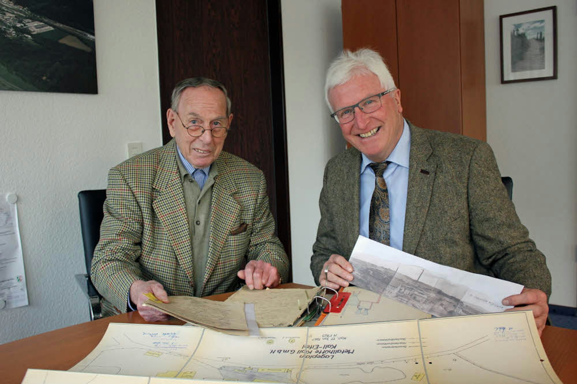 Willi Kerp (l.) überreichte Kalls Bürgermeister Herbert Radermacher alte Dokumente der Metallhütte.