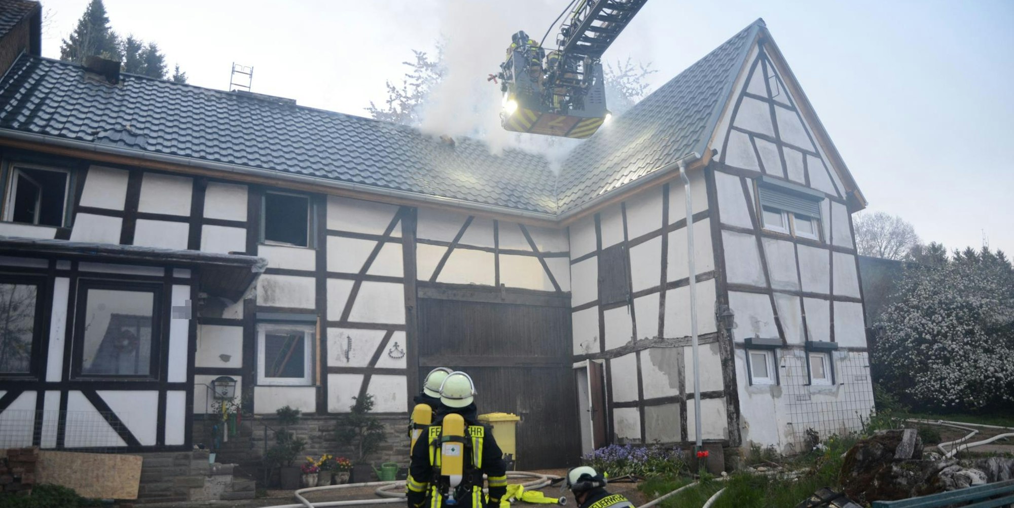 Das Feuer dehnte sich schnell vom Vordach auf das Dach aus. Die eigenen Löschversuche, die die Handwerker laut Feuerwehr-Einsatzleiter Jörg de la Motte unternommen hatten, waren nicht erfolgreich. Rund 60 Einsatzkräfte aus Kall, Sistig und Wahlen, die Besatzungen der Drehleiter aus Mechernich und des Atemschutzcontainers aus dem Schleidener Brandschutzzentrum sowie Mitarbeiter des Rettungsdienstes waren nach Golbach ausgerückt.