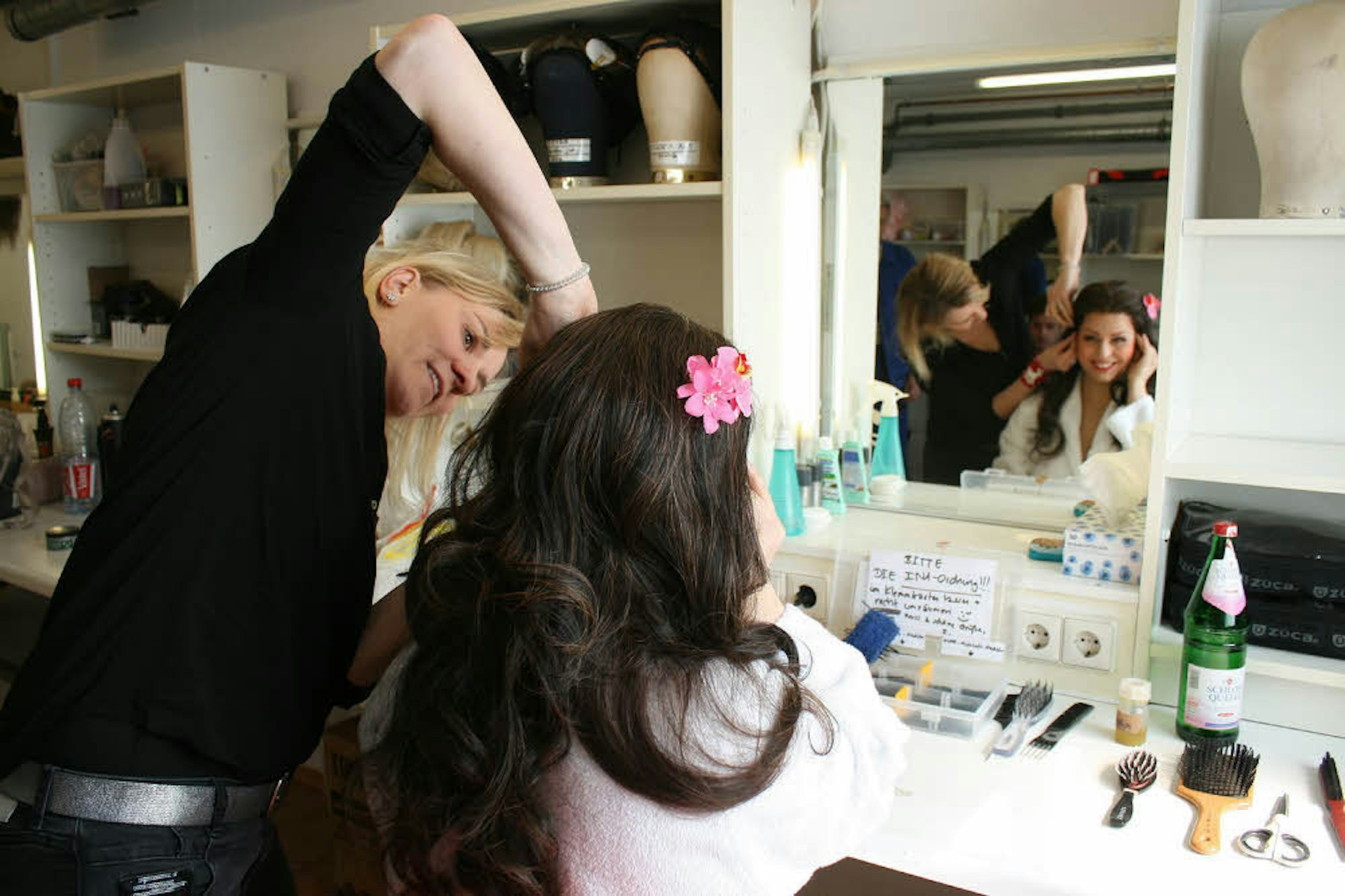 Für ihre Rolle als Jessica im Wolfgang-Petry-Musical steckt Maskenbildnerin Dorit Olmert Juliane Bischoff die Perücke fest.