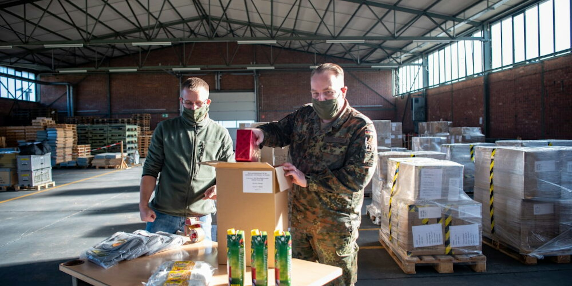 Stollen, Punsch und Geschenke verpackten Marco Groß (links) und Oberstleutnant Dirk Hagenbach im Materiallager in Mechernich. 4821 Päckchen wurden hier insgesamt gepackt, eins für jeden Soldaten im Auslandseinsatz.