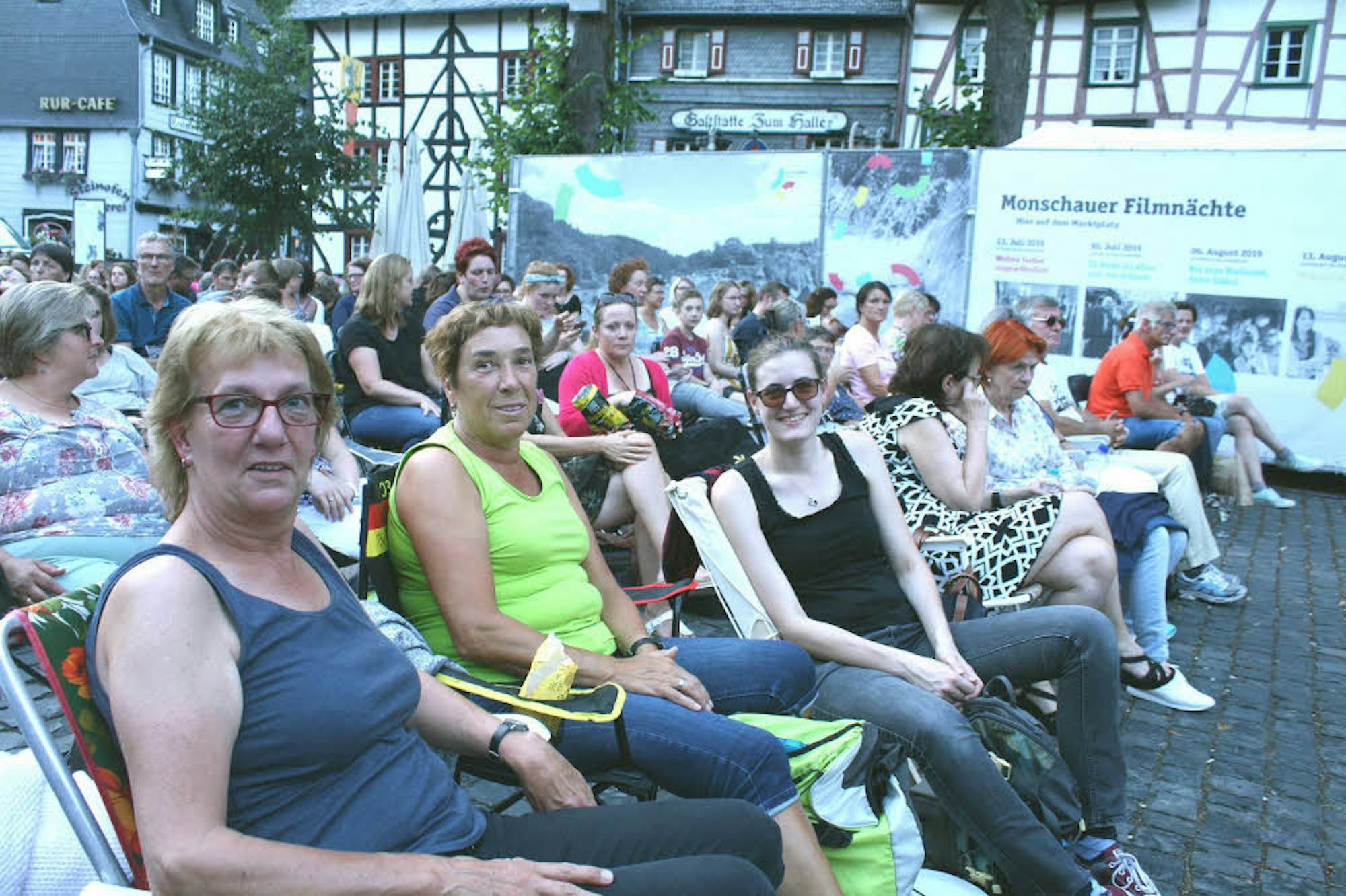 Verglichen mit dem Quartett aus Schleiden, das ein Plätzchen im hinteren Teil der Zuschauerreihen gefunden hat, hat sich ein Trio eindeutig besser positioniert: Reihe Eins, die Pole-Position. Das sei ihr Stammplatz, und deshalb seien die drei Frauen auch schon um 19.30 Uhr da. „Selbst wenn der Film erst mit Einbruch der Dämmerung kurz vor 22 Uhr startet“, so Ute Hansen aus Simmerath. Sie, Brigitte Huppertz aus Konzen und Anna Mertens aus Alsdorf sind treue Monschau-Open-Air-Kinogänger.
