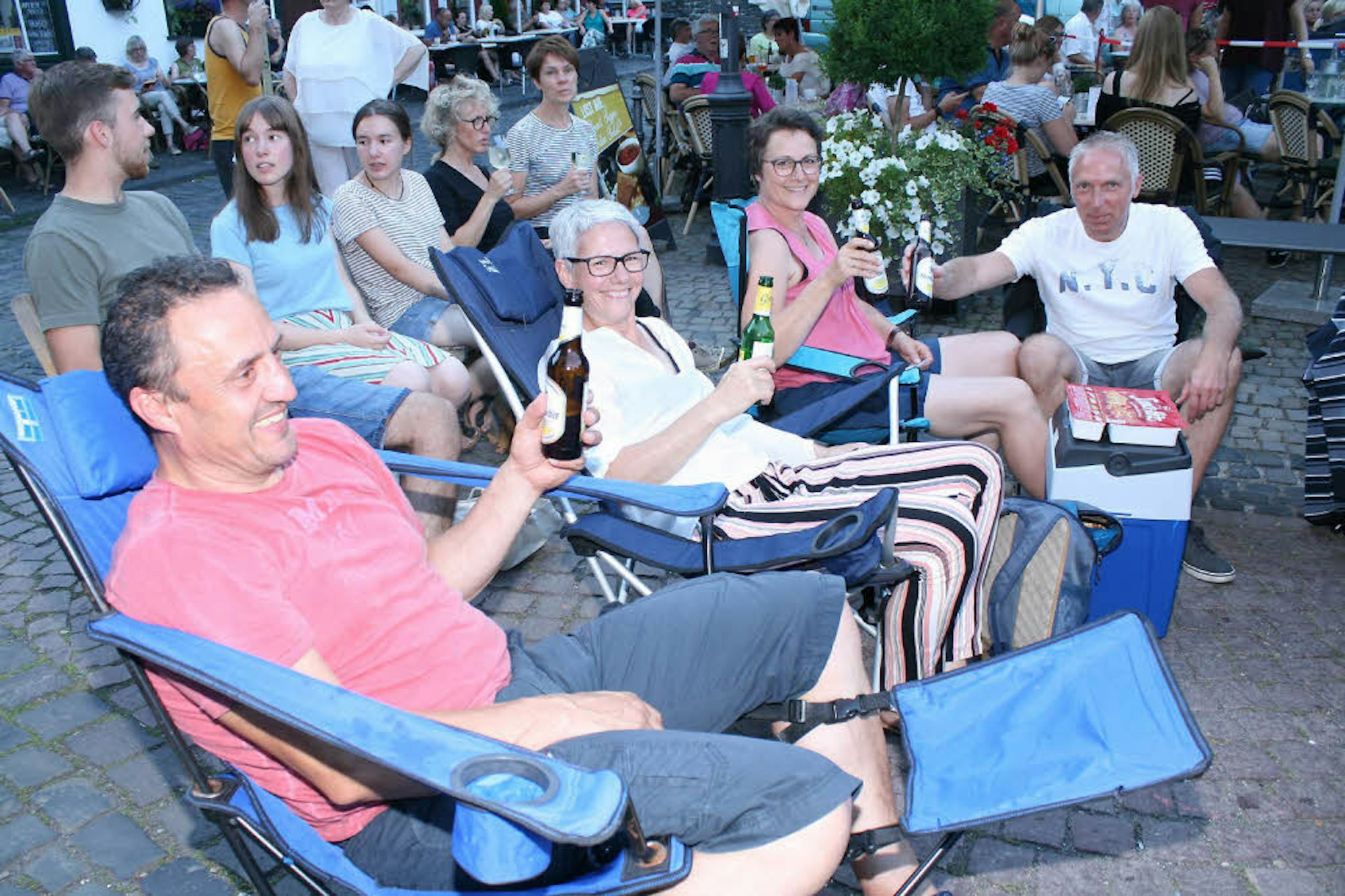 Und ihre Plätze auf den mitgebrachten Klappstühlen ohne Vordermann oder Vorderfrau haben fast schon „Tradition“. Da heißt es schnell sein, bevor andere schneller sind: „Wir kommen sofort nach der Arbeit hierhin. Verpflegung holen wir uns in der Gastronomie drum herum“, so Brigitte Huppertz. Die Stühle an den Tischen der Außengastronomie um den Marktplatz herum sind an diesem Abend natürlich ebenfalls schon lange alle besetzt.
