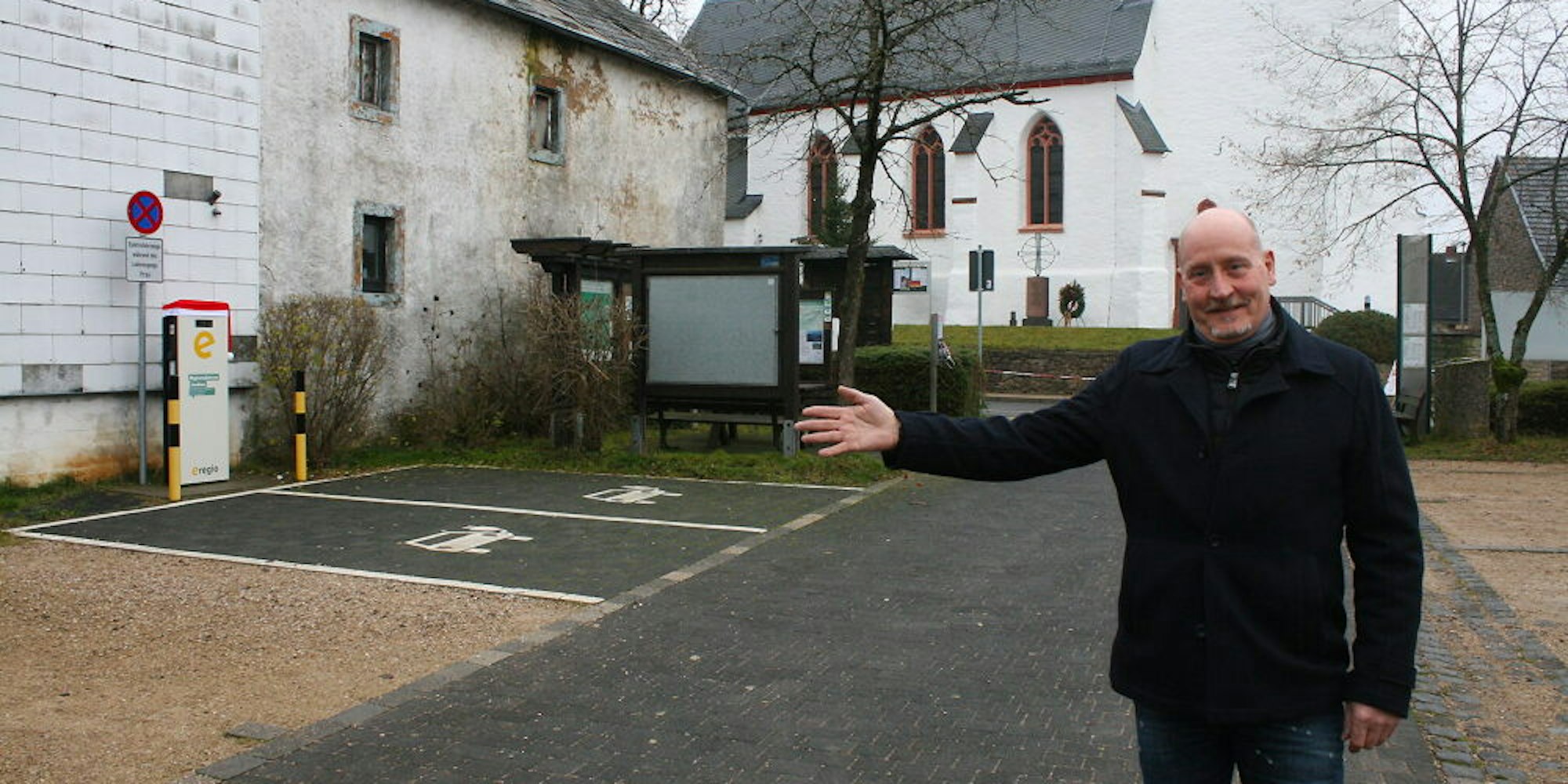 Gegenüber der Pfarrkirche steht der neue Ortsvorsteher Rudolf Huth auf dem Wochenmarktplatz des Ortes. Dort gibt es sogar zwei Ladestellen für Elektrofahrzeuge.