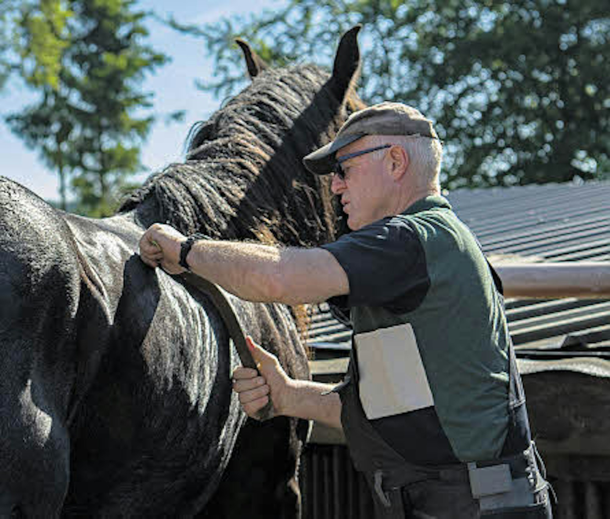 Nach der Dusche zieht er die überschüssige Feuchtigkeit mit dem Schweißmesser – einem gebogenen Metallstreifen – aus dem Fell. Lena Telöken bringt die Hufe mit speziellem Fett und Pinsel auf Hochglanz. Dann gibt es noch eine Zwischenmahlzeit, ehe es für die Kaltblüter in den Pferdeanhänger hinter dem Traktor geht.