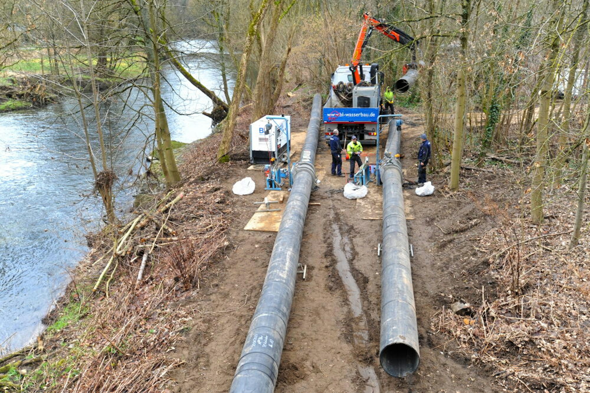 Am Ufer der Wupper haben Bauarbeiter damit begonnen, eine Umleitung für den Sammelkanal zum Klärwerk zu bauen, damit die unterirdischen Rohre ausgekleidet und abgedichtet werden können.