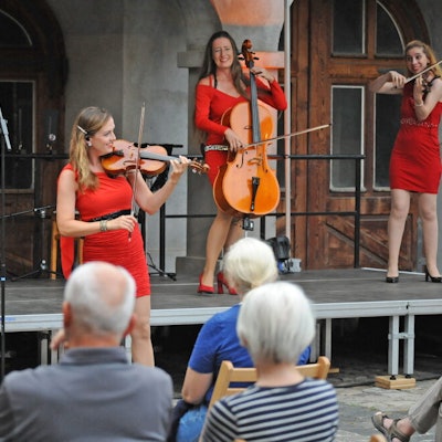 Nicht nur die Begleitung an Klavier und Gitarre umrahmte die Stimmung, auch die Sonne baute ihre eigene Dramaturgie auf. Zu Beginn noch schien sie das Publikum mit Gegenlicht ärgern zu wollen, betonte aber dafür die Silhouetten der Cool Cats. Ein Lichtspiel, das zum Schnipsen und Schulterschütteln der Sängerinnen passte.
