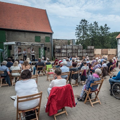 „Kultur auf dem Hof“ heißt die für die Corona-Zeit erfundene neue Veranstaltungsreihe, die bereits zum Gut Nesselrath und Müllerhof tourte. Dritter und vorerst letzter Termin war am Sonntag auf dem Sieferhof. Statt dicht gedrängt beim Kabarett im Café am Stadtpark saßen die Besucher auf Klappstühlen mitten in der Reithalle in Grüppchen getrennt. Für Rebecca Hermann von der Stadtverwaltung ist das diesjährige Programm zwar nicht gleichzusetzen mit den vergangenen. Aber die neue Reihe sei eine Ergänzung, die hervorragend zur Blütenstadt passt, die ja viele wunderbar gepflegte Höfe aufweisen kann.