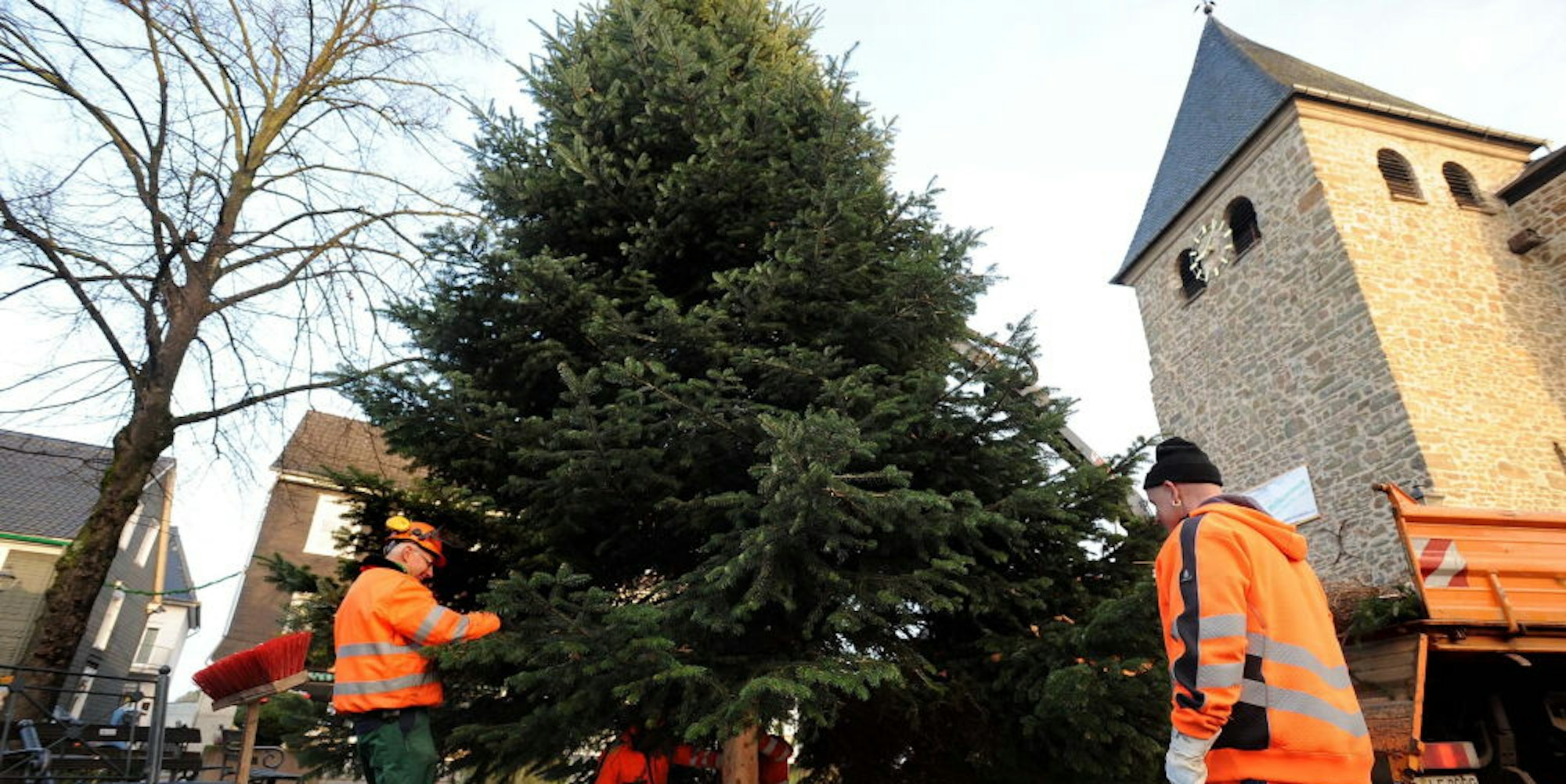 Nordmanntanne für Witzhelden: Die Männer vom Bauhof auf dem Marktplatz.