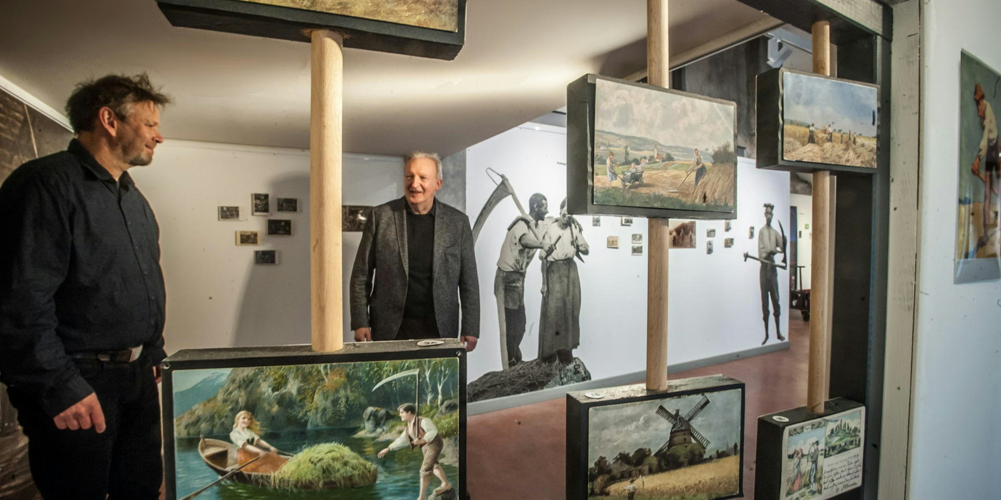 Sensen in allen erdenklichen Variationen auf Postkarten: Jürgen Bandsom (l.), Leiter des Sensenhammers, und Hans Schmitz vom Literaturbüro Leverkusen begutachten die Ausstellung.