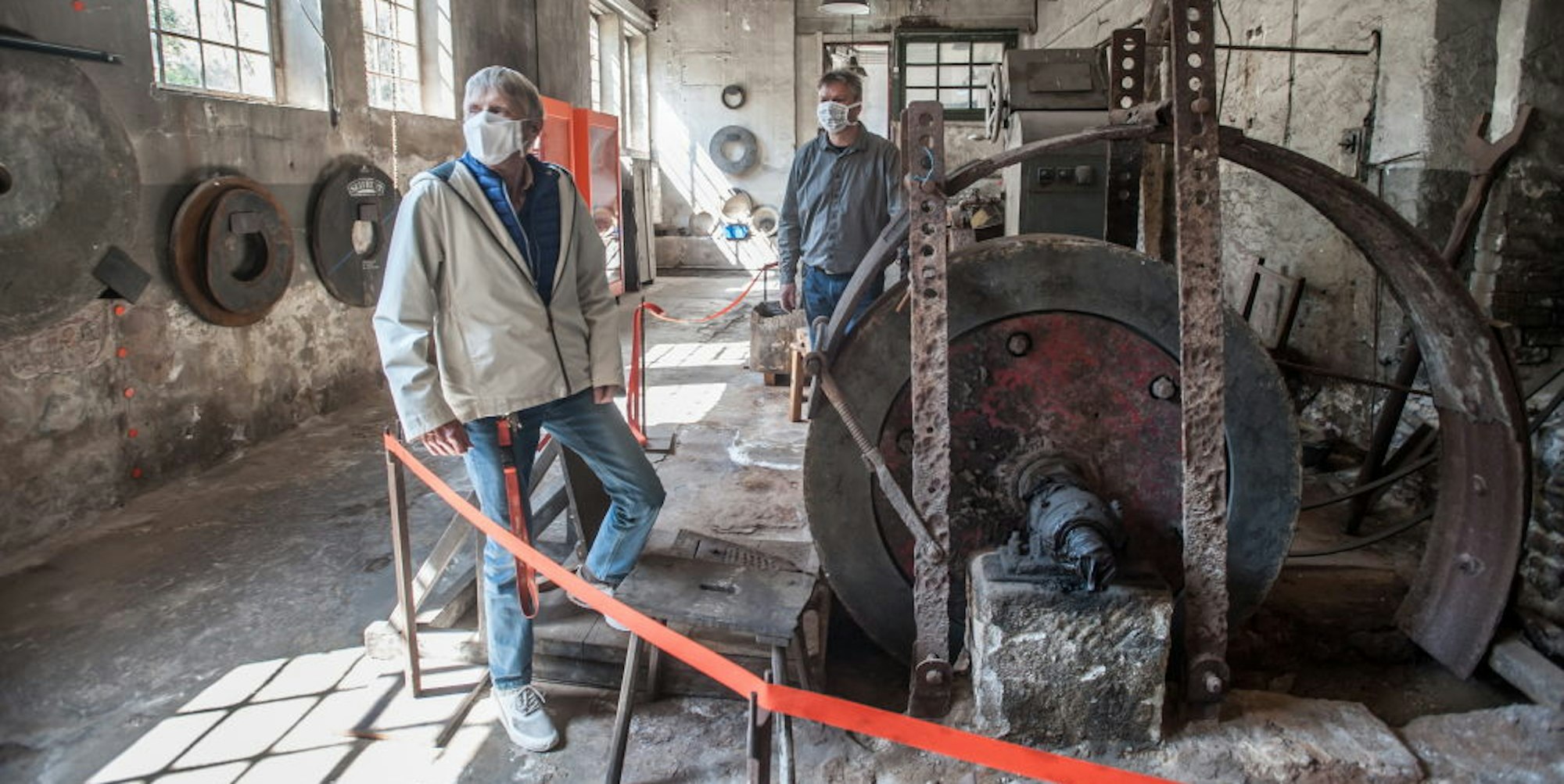 Im Eingangsbereich des Industriemuseums trennt jetzt eine Plexiglasscheibe Kassenwarte und Besucher voneinander. Eine rote Bande an zwei schmiedeisernen Ständern sorgt für zusätzlichen Abstand. Die Personaltoilette wurde zur Gästetoilette umfunktioniert. Die Devise: Möglichst wenig Kontakt, möglichst viel Raum.
