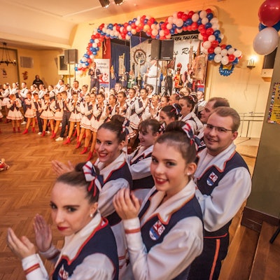 Das „Kinder- und Jugendtanzcorps L(e)ev Pänz“ zieht ein: 18 Mädels und ein Junge, nach Größe geordnet. Der 17-jährige Julien Lein hat sichtlich Spaß an seiner Rolle als Kommandant und Tanzoffizier. Auf der Bühne moderiert er mit Schwung durch die Tänze, hebt jedes der jungen Mariechen einmal und singt die Texte mit. „Es ist wirklich sehr schön in der Gruppe“, erzählt Julien nach den Tänzen. „Ich habe die Mariechen um mich und kann sie unterstützen.“ Seit 2017 ist das Korps Mitglied im FLK.