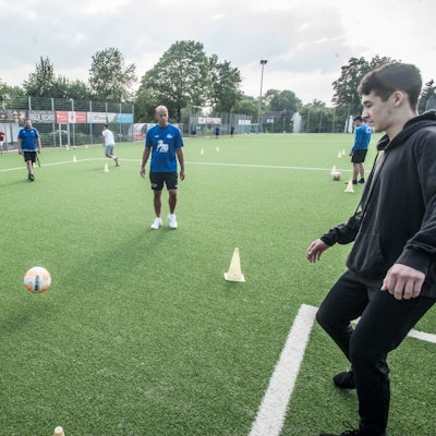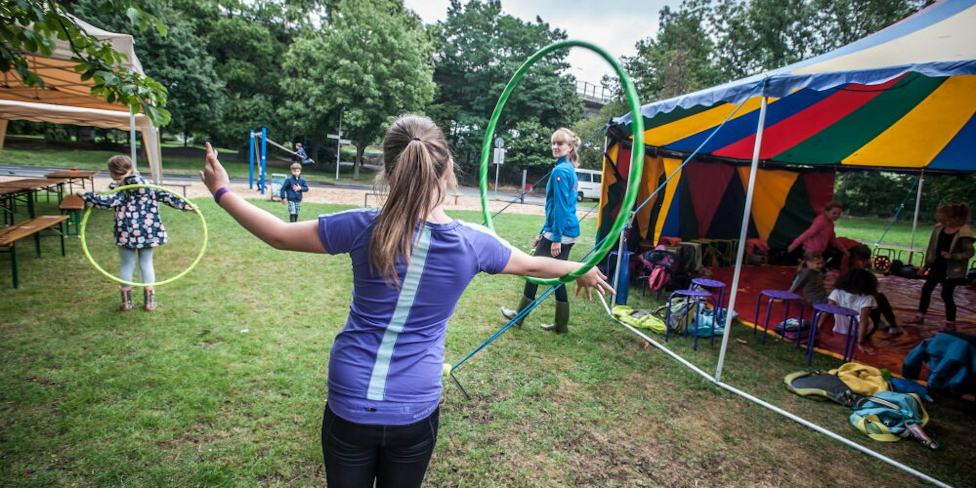 Leverkusen – Auf der Wiese steht ein kleines, blau-rotes Zirkuszelt. Darin: Etliche Kinder, die jonglieren, versuchen, Teller zu drehen, und den Hula-Hoop-Reifen schwingen. Der „Spielzirkus“ ist Teil des Sommerferienprogramms der „Jugendszene-Lev“. Ein paar Jungs spielen im strömenden Regen Fußballgolf, eine Variante, die den körperkontaktlosen Sport ermöglicht. Weiter hinten, regengeschützt unter der Autobahn, wird mit BMX-Rädern und Skateboards herumgekurvt. Aber auch der selbst gebackener Marmorkuchen will beachtet werden.