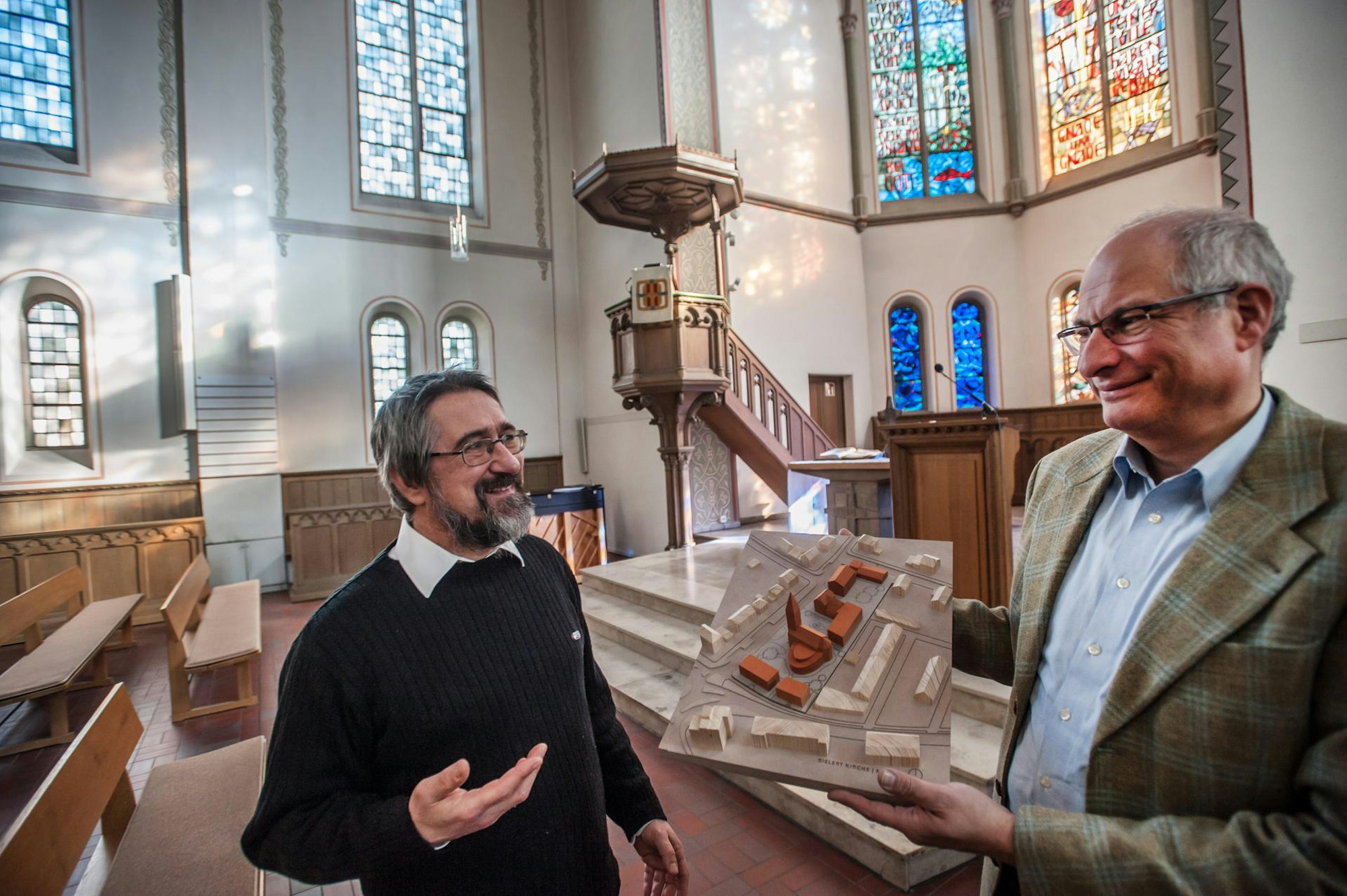 Veränderung als Chance: Martin Weidner und Stephan Noesse präsentieren ein Modell für das neue Zentrum am Bielert.