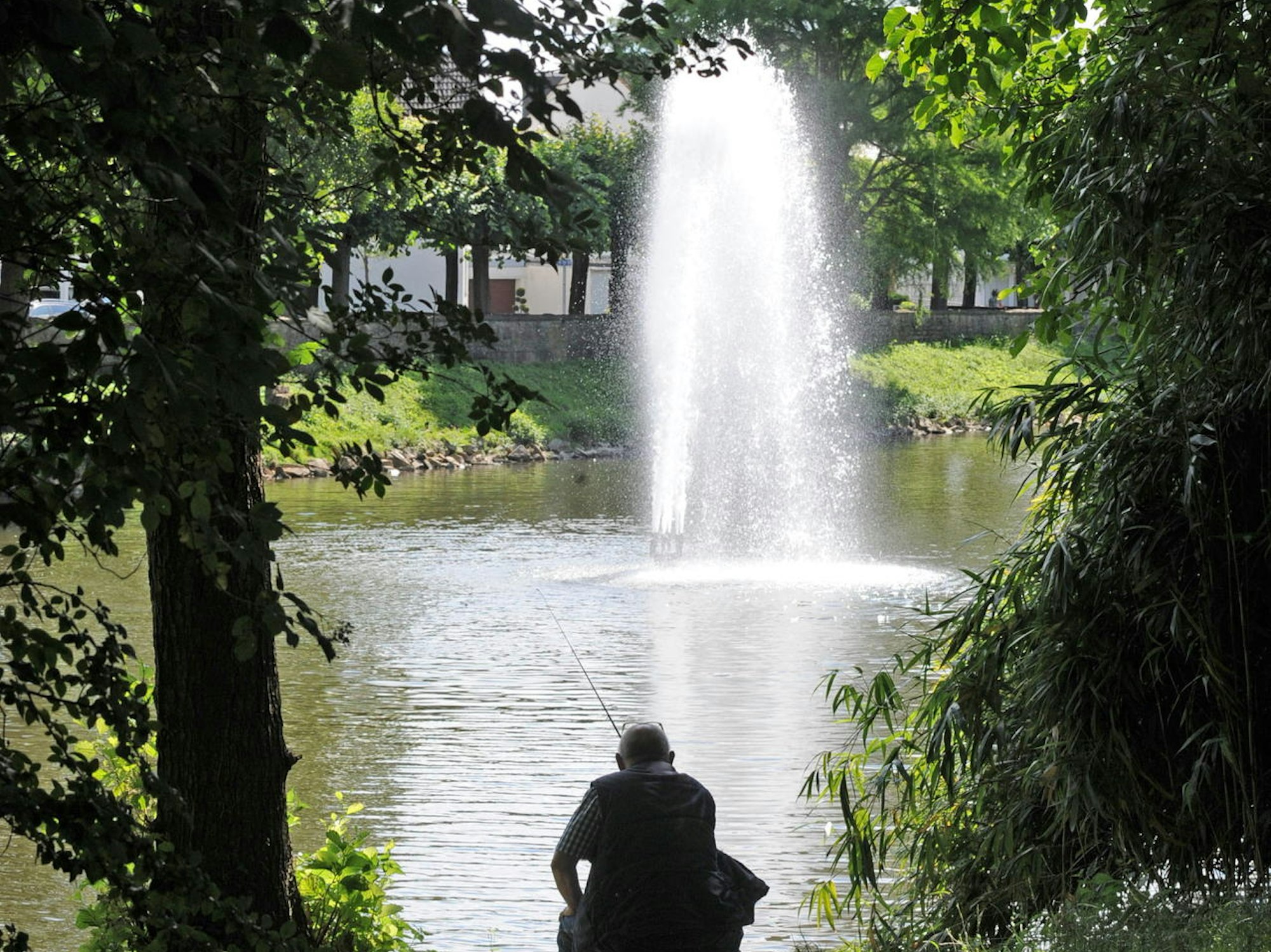 Der Ludwig-Rehbock-Park am anderen Ufer lockt mit einer Fontäne im Weiher. Dahinter reihen sich kleine Bäumchen in eine von Fahrradfahrenden bevölkerten Allee. Hier kann man sich ein Plätzchen suchen und das weiße Rauschen die Sinne benebeln lassen. Hohe Pappeln spielen mit in dieser Komposition, ebenso wie der plätschernde Fluss, auf den man von der langen Brücke aus schauen kann.